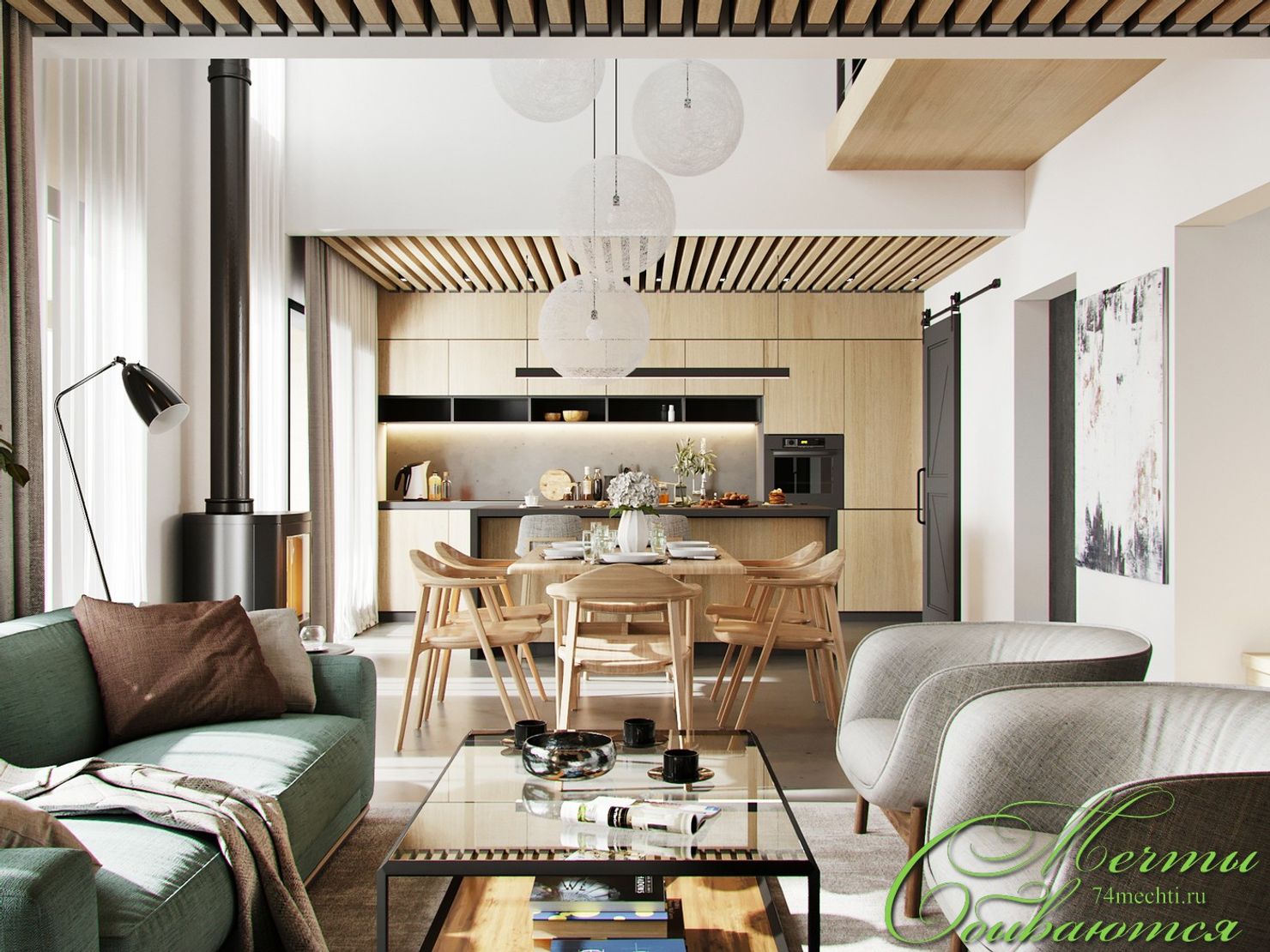Этот проект от компании архитекторов Латышевых «Мечты сбываются» — яркий образец стиля контемпорари. Диван насыщенного бирюзового оттенка, футуристичная золотая люстра, серая кухня с барной стойкой и уютный камин создают гармоничный и модный ансамбль. Интерьер выглядит настолько безупречно, что кажется, будто он сошёл со страниц авторитетного дизайнерского журнала.