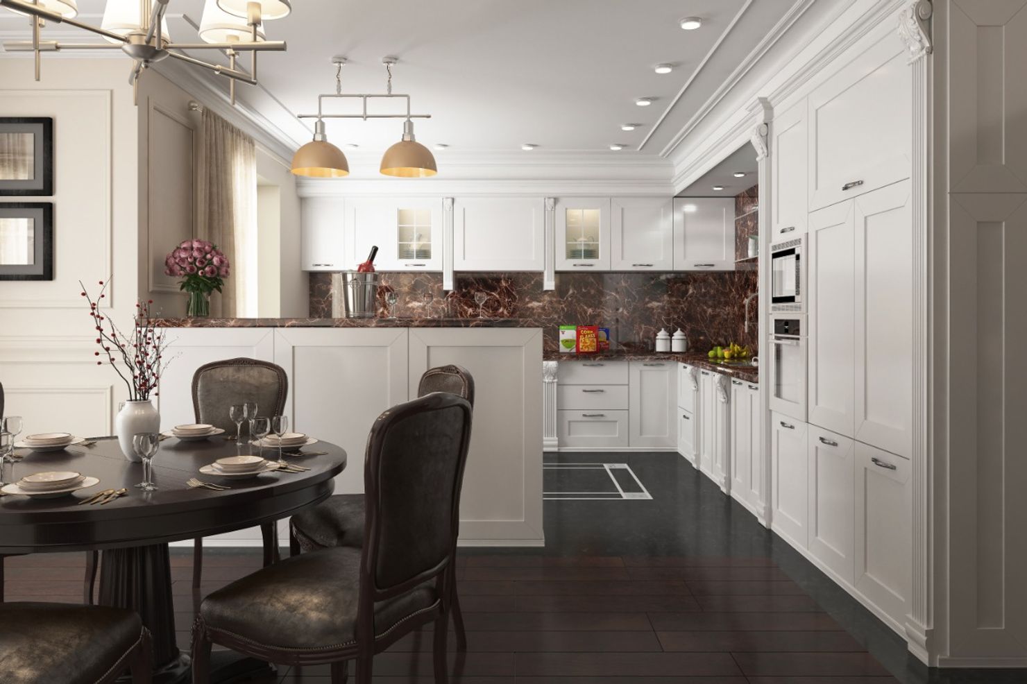 Чёрно-белая кухня-столовая в духе неоклассики