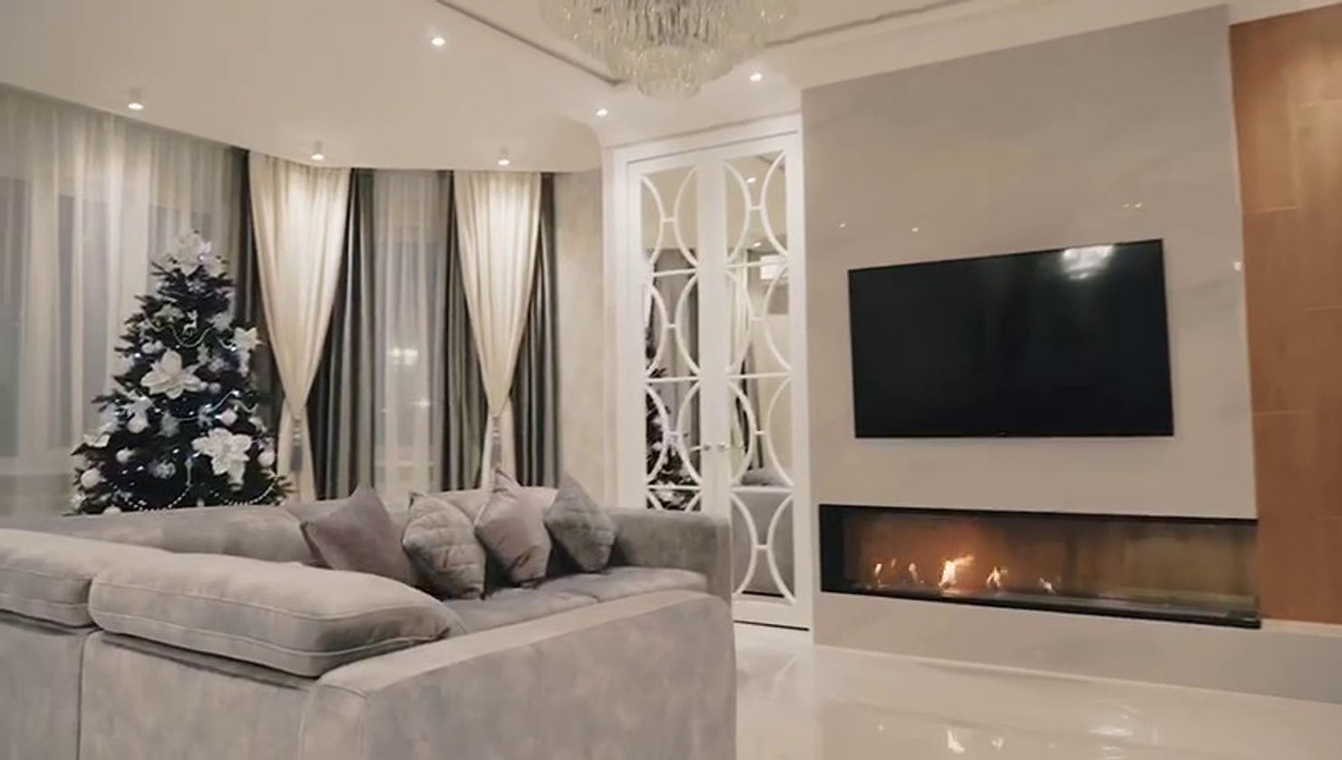 Элегантная серебряно-белая палитра служит идеальным фоном для современного биокамина. Узнаваемые черты ар-деко прочитываются в зеркальных поверхностях мебели, геометричных линиях и роскошной люстре, создавая атмосферу гламура и ретро-футуризма.
