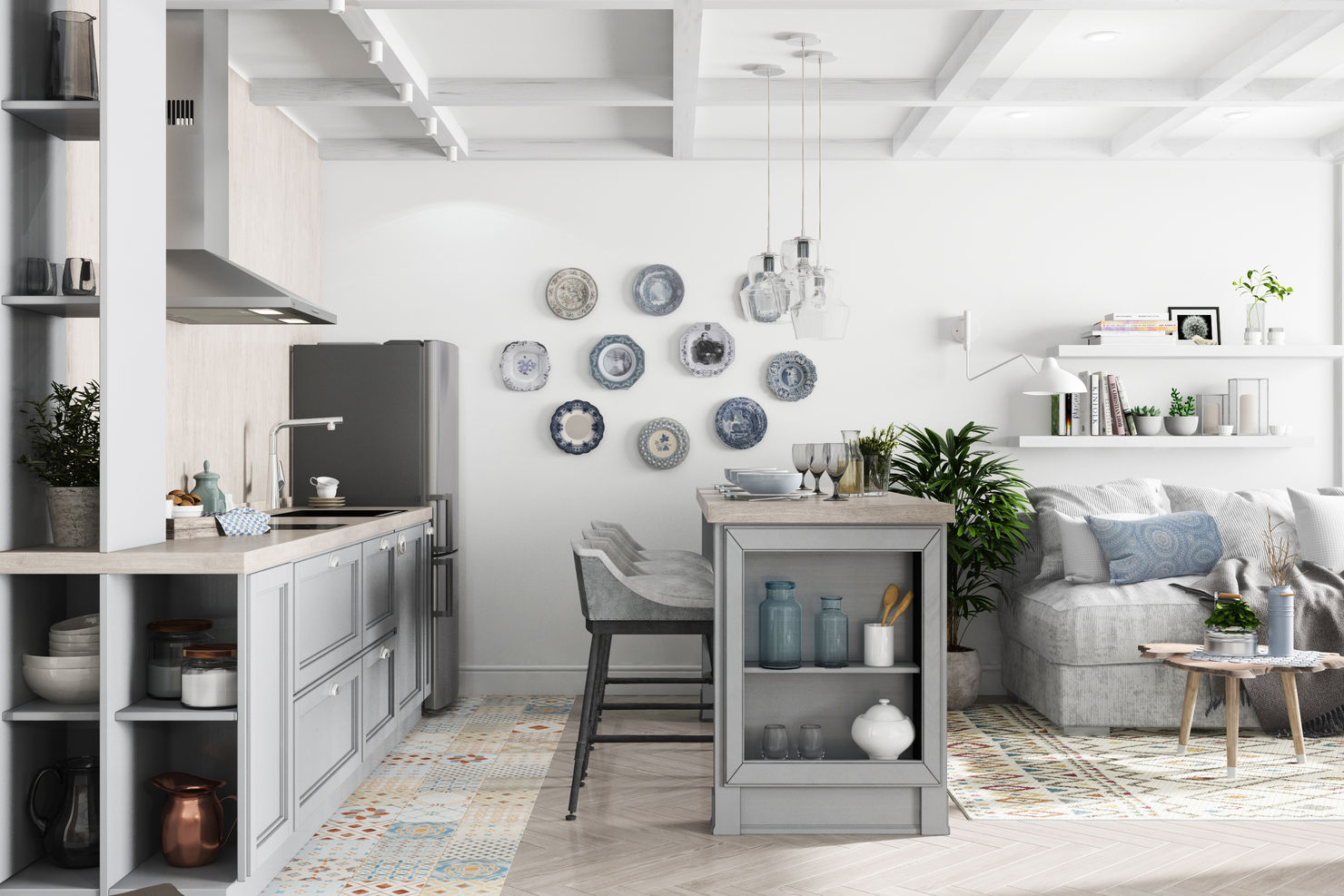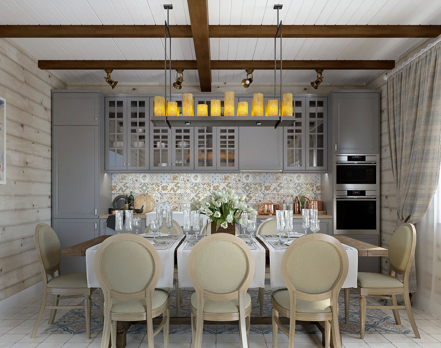 Бело-серая кухня на стыке прованса и средиземноморского стиля