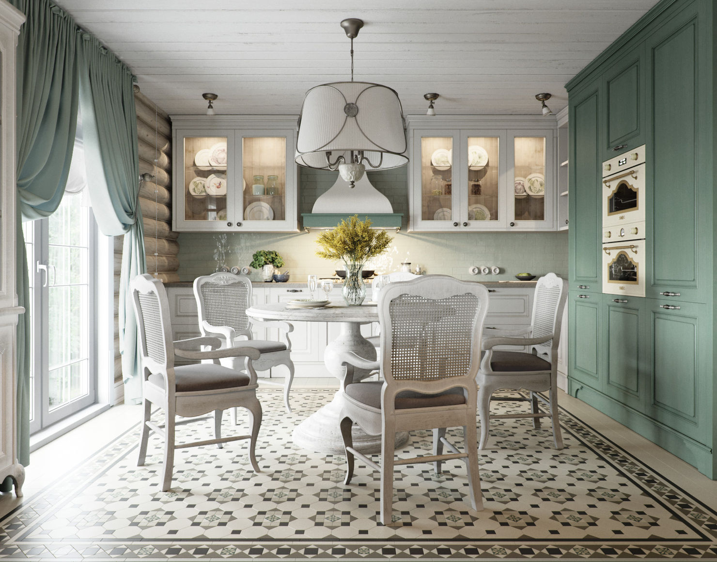 Элегантная кухня в бело-зелёной гамме с акцентом на напольное покрытие