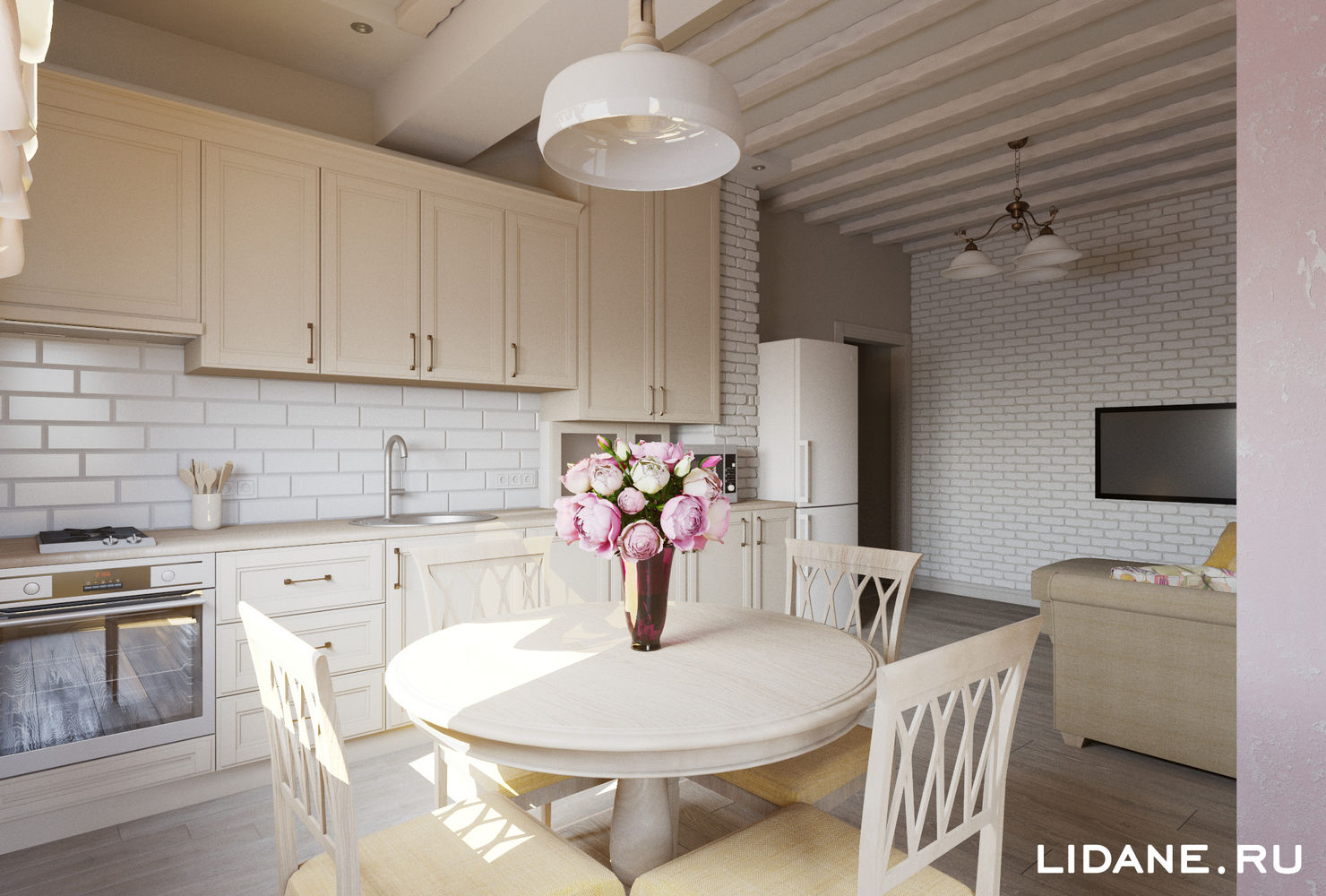 Дизайнеры студии IvE-Interior наполнили пространство особой атмосферой. Столешница насыщенного шоколадного оттенка создаёт вкусный контраст с нежными фасадами, а изящные резные элементы на гарнитуре добавляют интерьеру рукотворного шарма и винтажного настроения, характерного для настоящих французских загородных домов.