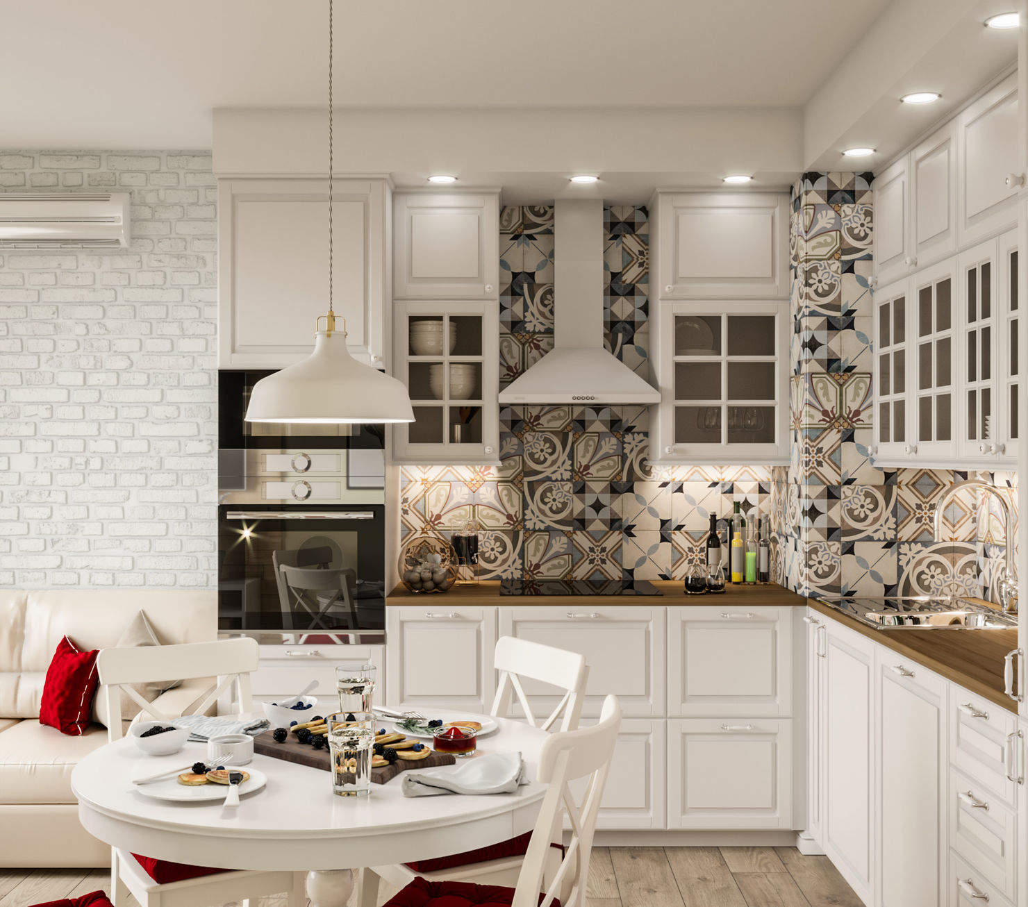 Классическая белая кухня с акцентным фартуком и буфетом