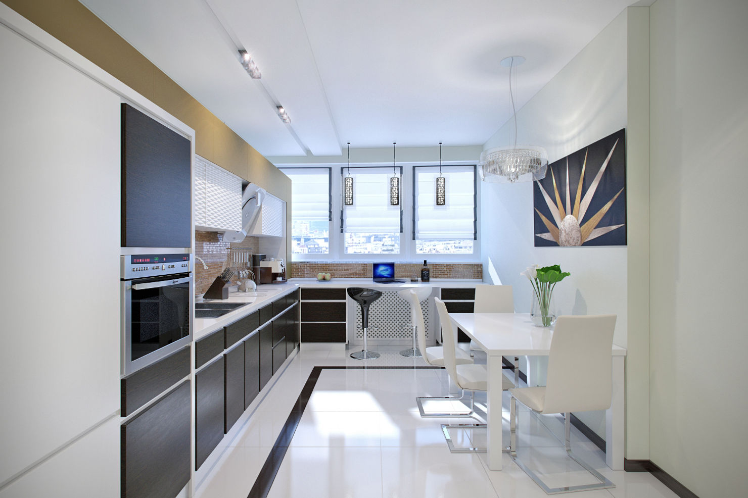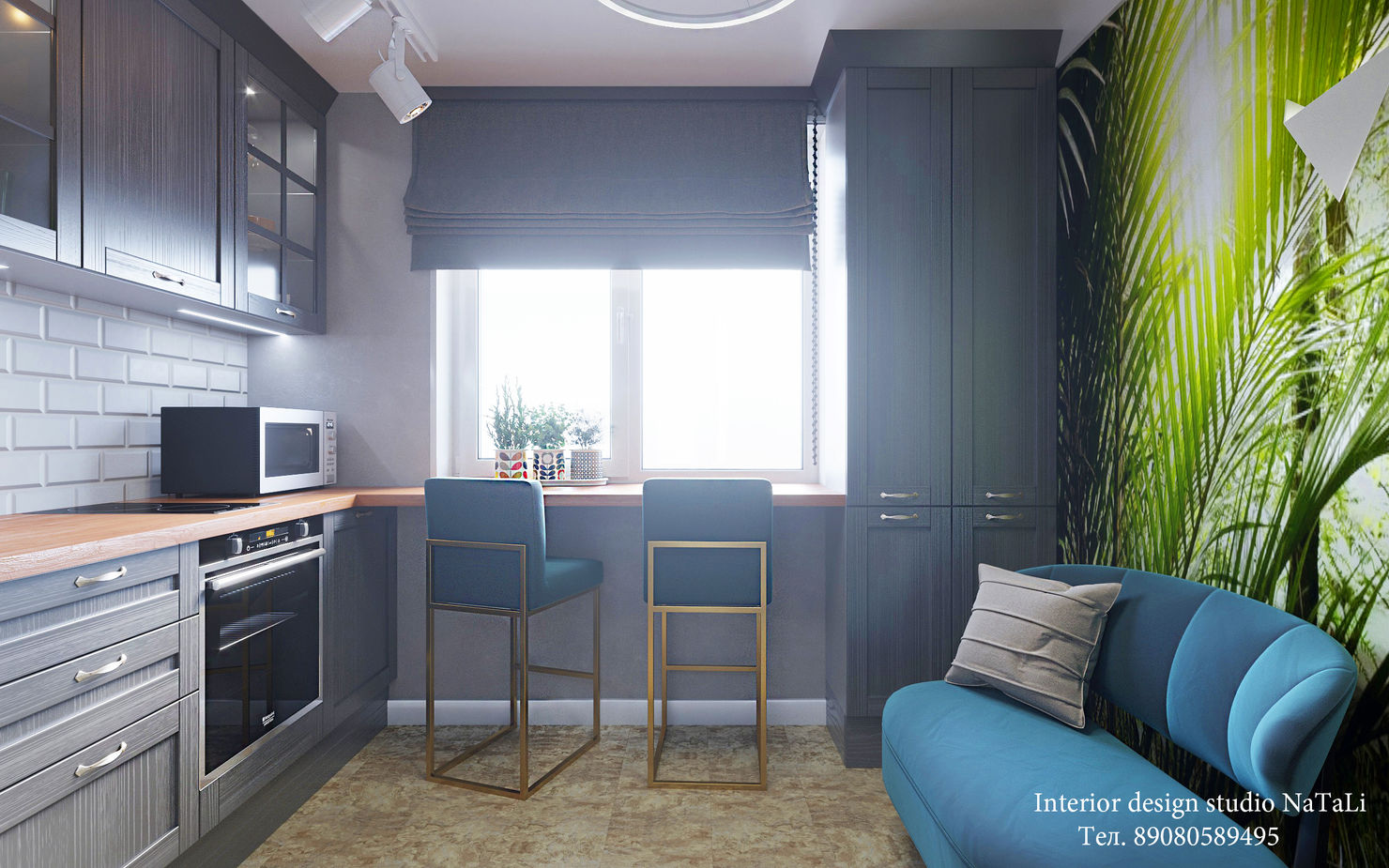 «Улитка» — это вариация П-образной кухни для очень ограниченного пространства, где барная стойка может присутствовать или отсутствовать. Часто такой приём используется при обустройстве кухни на лоджии.