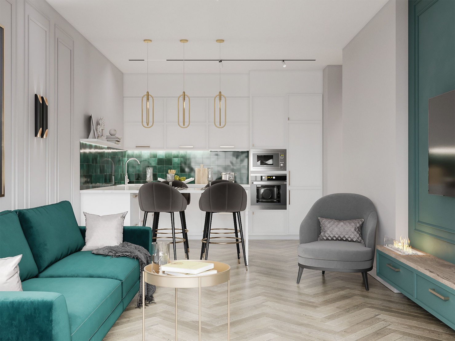 Барная стойка — компактная и стильная альтернатива полноценной обеденной группе, особенно актуальная для студий и помещений с дефицитом площади. Она придает интерьеру современный, слегка американский шарм.