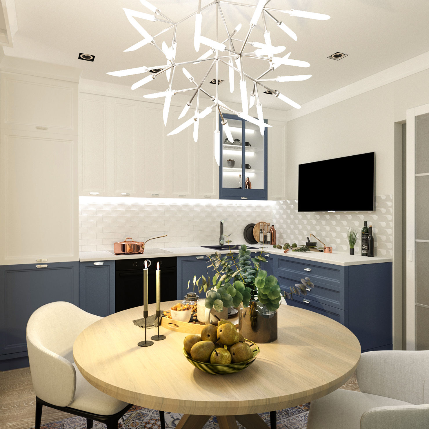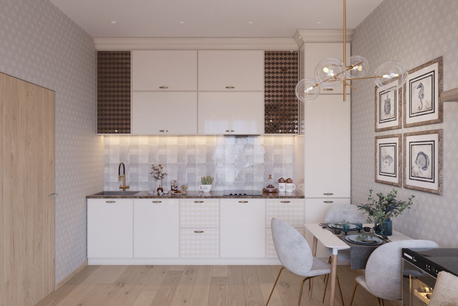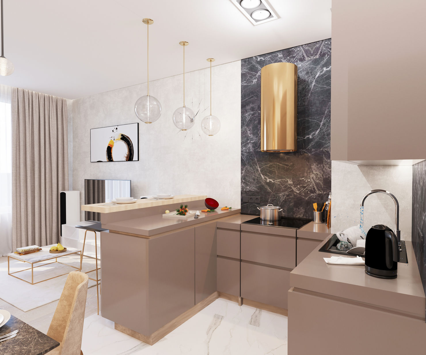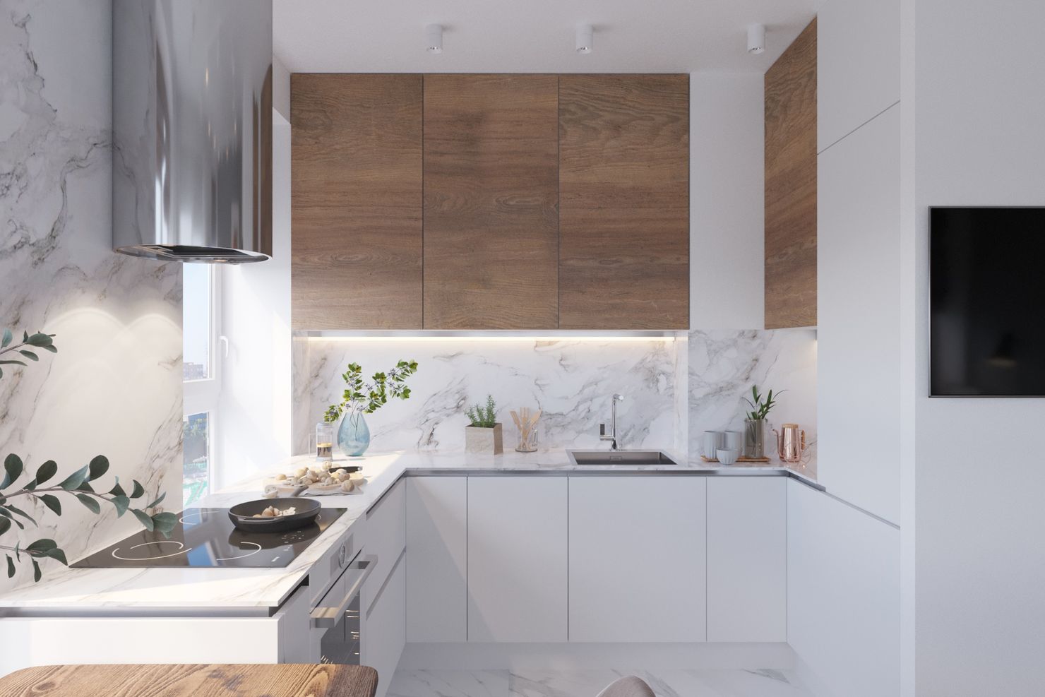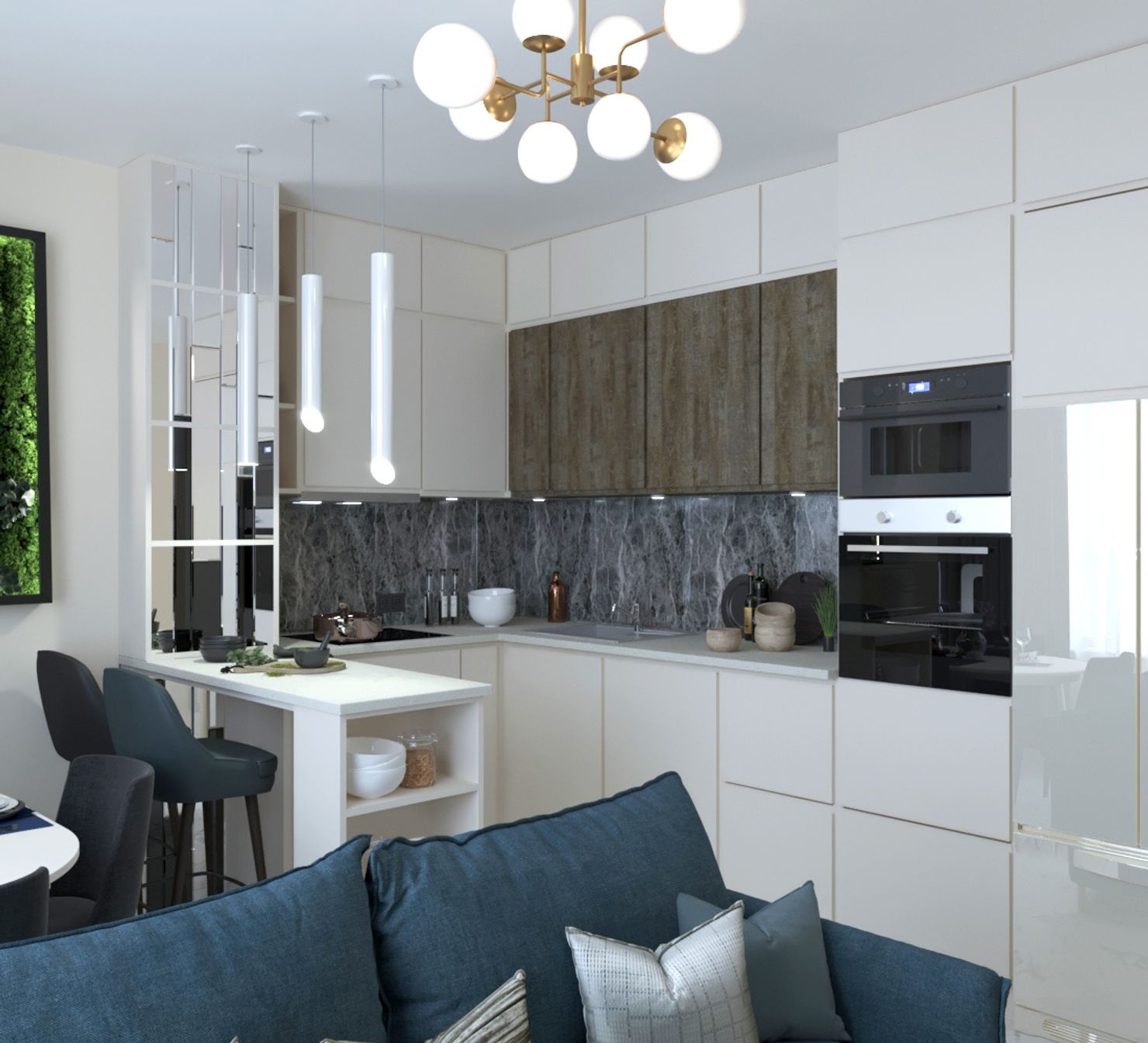 Угловая кухня, дополненная лаконичной барной стойкой (по сути, продолжением столешницы на опорах), может стать идеальным решением для очень маленьких квартир, экономя место для обеденной зоны.
