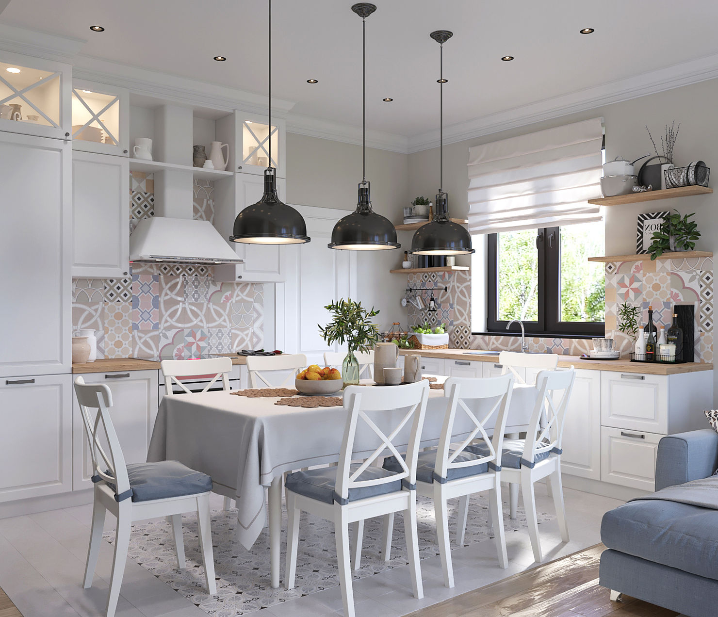 В этой неформальной планировке обеденный стол не стоит отдельно, а вплотную примыкает к острову или краю кухонного гарнитура, создавая уютную и интегрированную зону для приёма пищи.