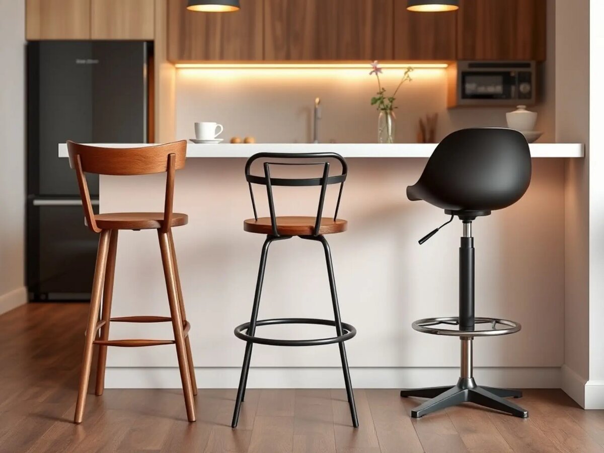 - Лофт: стулья-треноги из дерева или металла с индустриальным духом, часто с регулировкой высоты вращением сиденья.