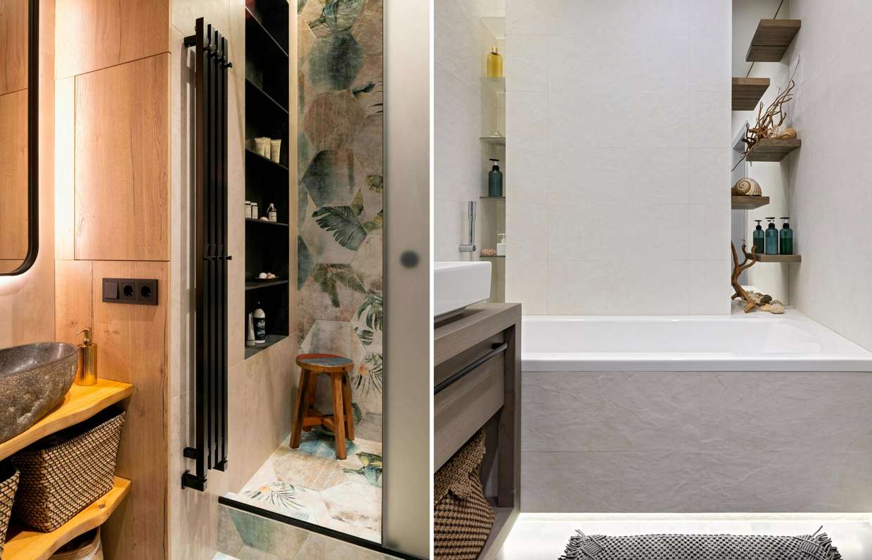 Встроенные ниши в стенах – это элегантная альтернатива навесным полкам. Их можно расположить в любой свободной зоне: над унитазом, рядом с душем или раковиной. Для сохранения стиля и экономии пространства предпочтительны раздвижные, а не распашные дверцы.
