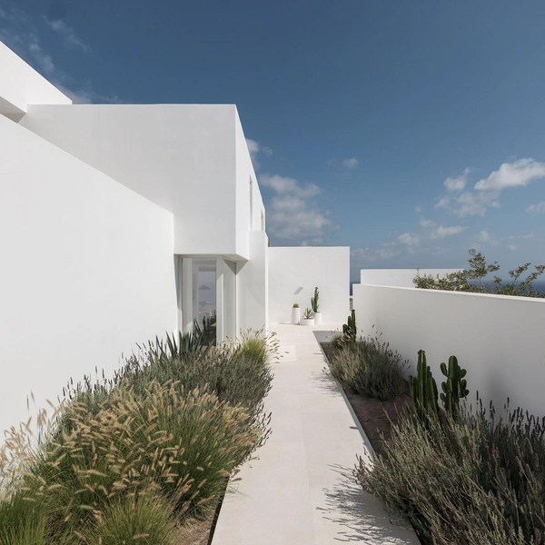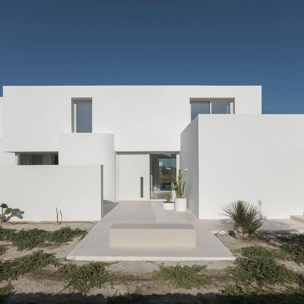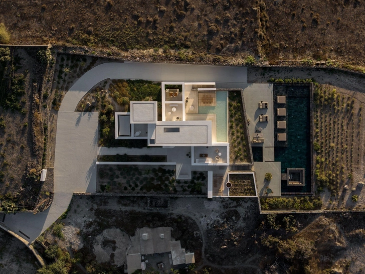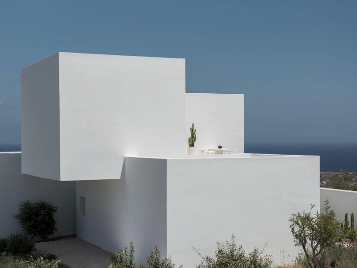 Дом сразу узнается по характерным для Кикладских островов белым кубическим формам, но выглядит при этом свежо и современно. Четкие геометрические линии создают игру света и тени в течение дня — здание буквально оживает под солнцем.