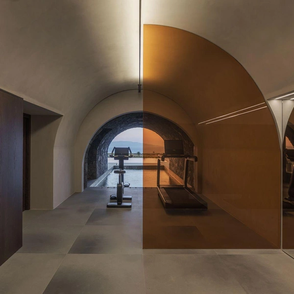 А под землей, в прохладе, устроили дополнительные спальни, кабинет, спортзал и даже винный погреб. Эта часть дома напоминает традиционные пещерные жилища Санторини, но со всеми современными удобствами.