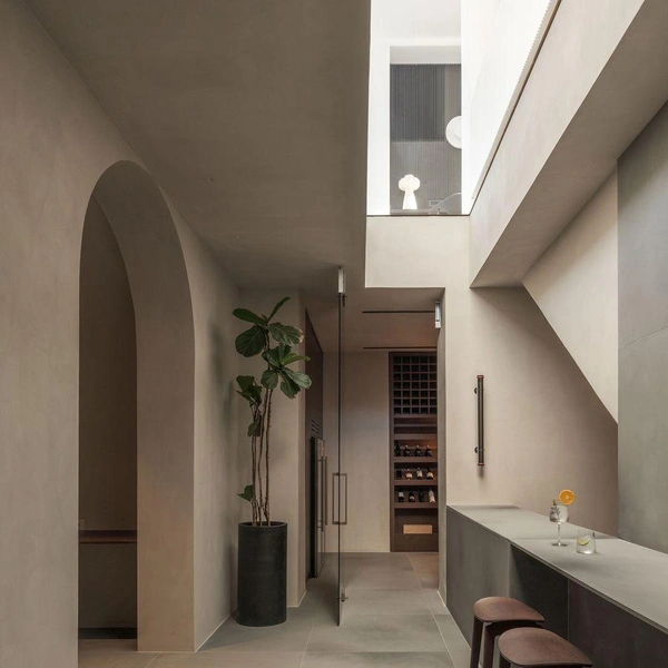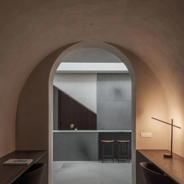 Внутри царит атмосфера спокойствия и гармонии. Светлые тона, натуральные материалы, встроенная мебель — все подчинено идее единства с природой. Даже в подземных помещениях, где стены окрашены в теплые землистые цвета, нет ощущения замкнутости — повсюду окна и выходы во двор.