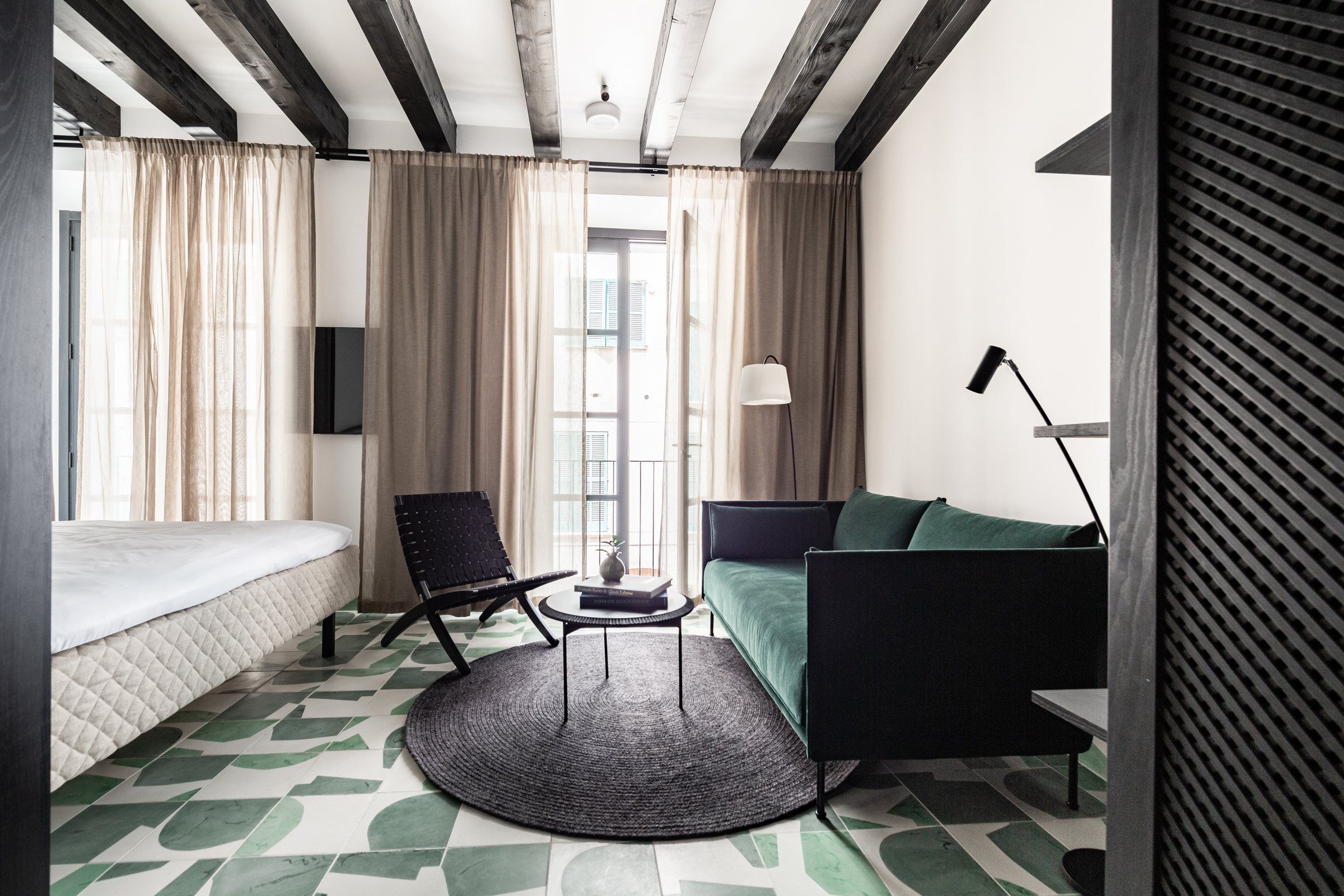 Номера отеля — это мастерский урок контрастов. Массивные чёрные потолочные балки, сохранившиеся с XVI века, и тёмные двери создают выразительный графический рисунок на фоне светлых, почти белых стен. Этот строгий фон смягчается деталями: бело-зелёная плитка отсылает к традиционному майоркинскому стилю, а лёгкие ткани, плетёная мебель из ротанга и живые растения наполняют пространство воздухом и лёгкостью, характерной для средиземноморского побережья.