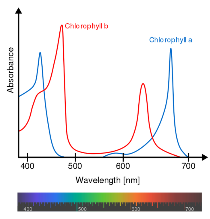 Для больших и сложных молекул из множества атомов, как, например, у фотосистем, таких строгих ограничений нет. Там допускается довольно широкий диапазон длин волн. Более того, у хлорофилла, одного из пигментов, таких диапазонов два. На этом факте основывается тот самый график, несправедливо называемый кривой McCree, который уже набил всем оскомину. На нем отмечены пики поглощения в районах синего и красного цвета.