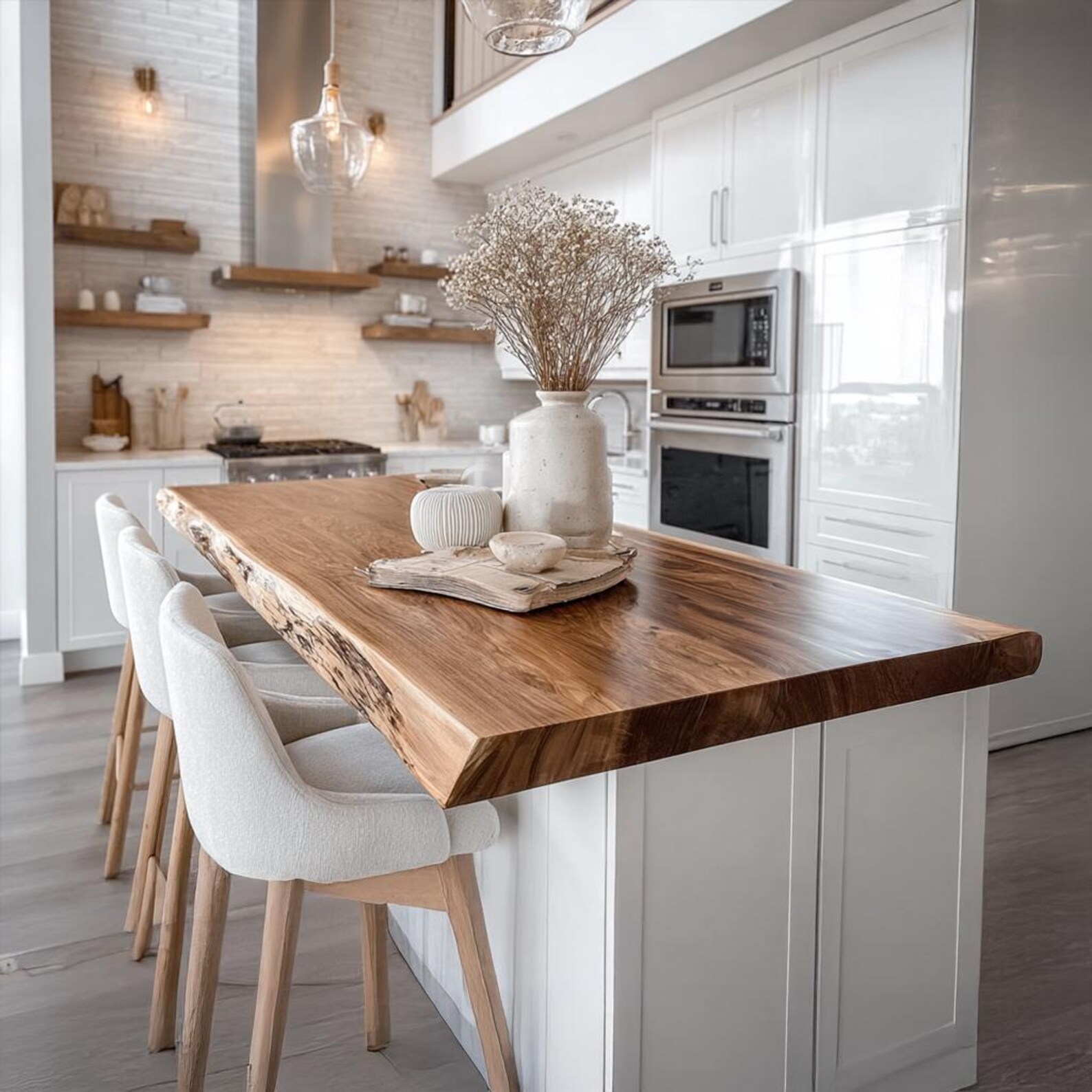 В контексте современной белой кухни деревянный остров выполняет роль идеального контрастного акцента. Он добавляет визуальное тепло, фактуру и материальность, разбавляя монохромность.
