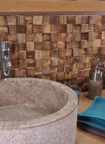 2. Мозаика для ванной. «Сайдинг» из переработанного дерева подойдёт даже для комнаты с повышенным уровнем влажности. Например, для ванной. А его текстура и декоративный эффект (натуральность дерева) поможет Вам добиться наилучшего результата для комнаты, целью которой является достижение релакса!