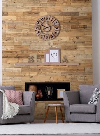 5. «Тёплый» акцент для гостиной. Идеальное решение для квартиры, которая находится в самом центре шумного мегаполиса – фальш-камин, обрамлённый деревом! Но не натуральным, а панелями, сделанными из переработанного многолетнего растения. Казалось бы, всего лишь имитация, но какая?