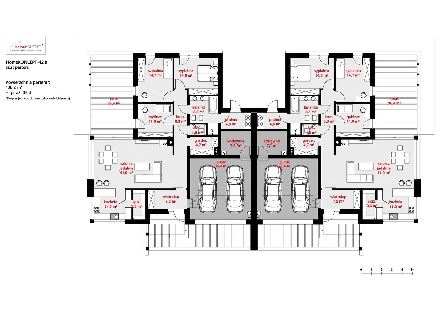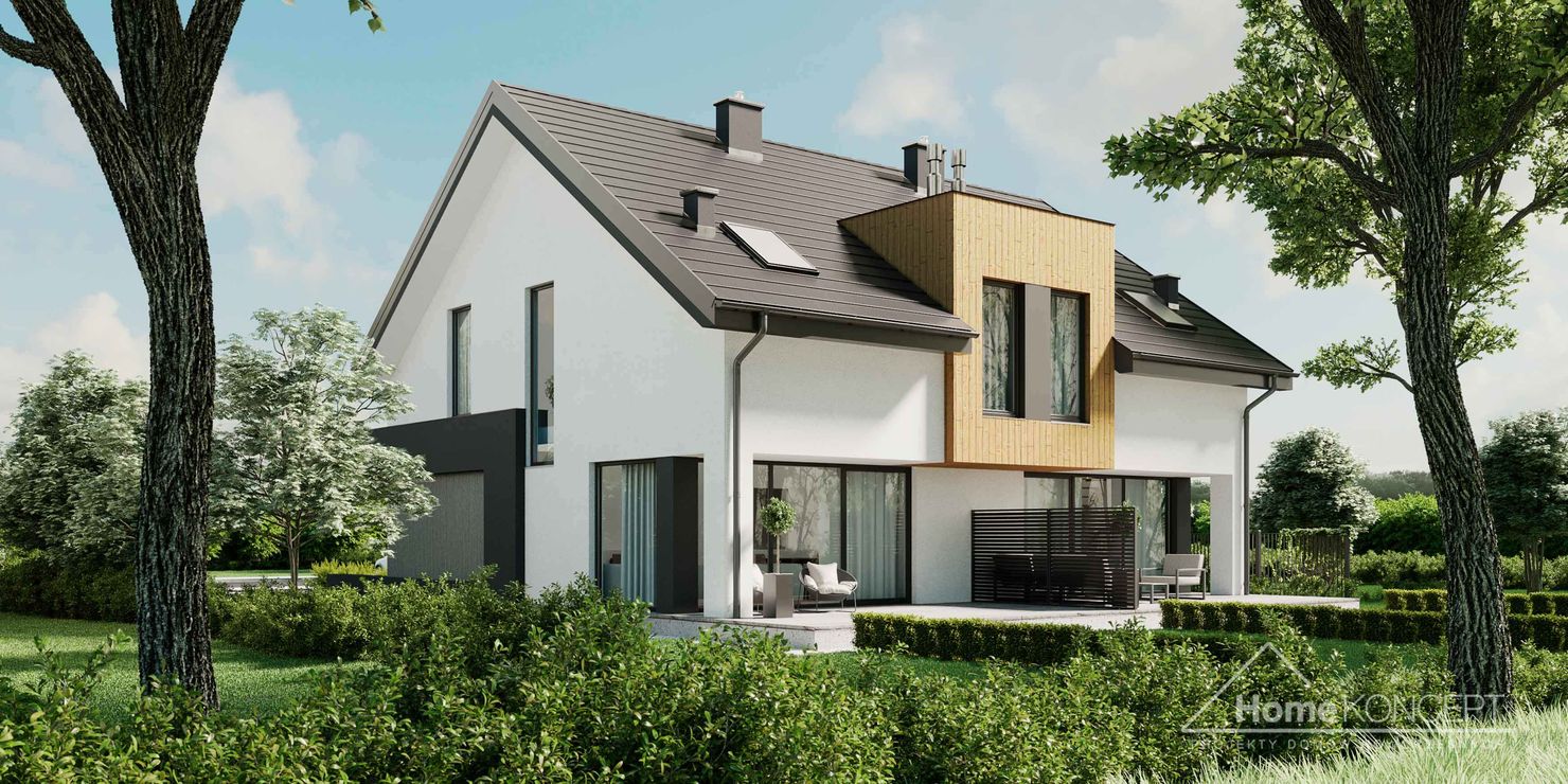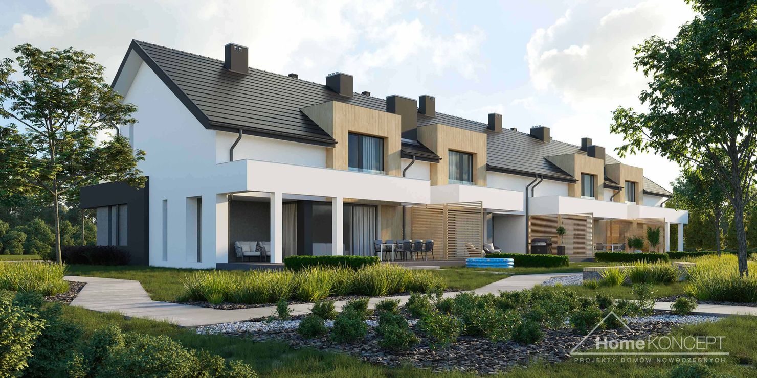 Внешне этот дом выглядит как цельный современный коттедж, но внутри он разделен на два узких и компактных таунхауса. Такой подход позволяет создать иллюзию единого архитектурного объема, сохранив при этом полную автономность каждого жилого блока.