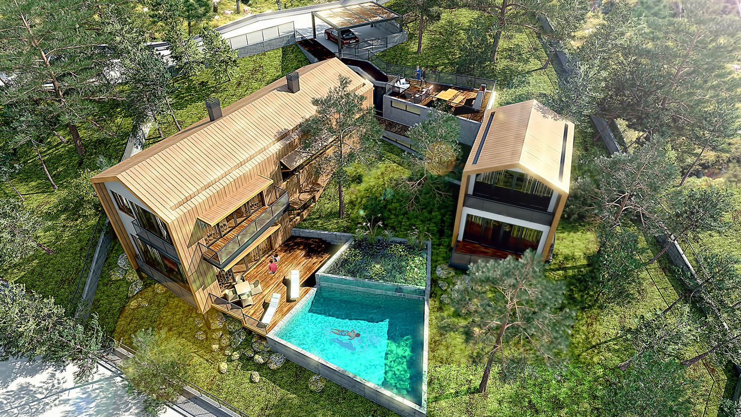 Люксовый проект в стиле минимализм, где две виллы частично соприкасаются, образуя единый архитектурный ансамбль. Они гармонично вписаны в общую зеленую зону поселка, что подчеркивает концепцию единства с природой и лаконичность форм.