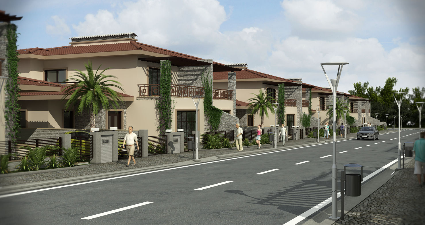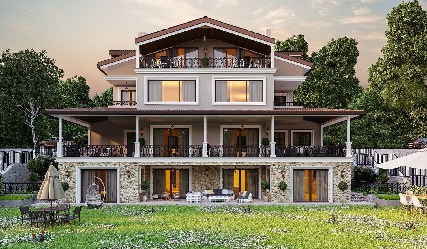 Этот проект предлагает роскошное проживание в двух просторных коттеджах, оформленных в духе загородного кантри. Площадь каждого дома составляет около 300 квадратных метров. Архитектура сочетает каменную отделку первого этажа со штукатуркой на втором и мансардном уровне. Внутри предусмотрено от пяти до шести спален, что идеально подходит для больших семей.