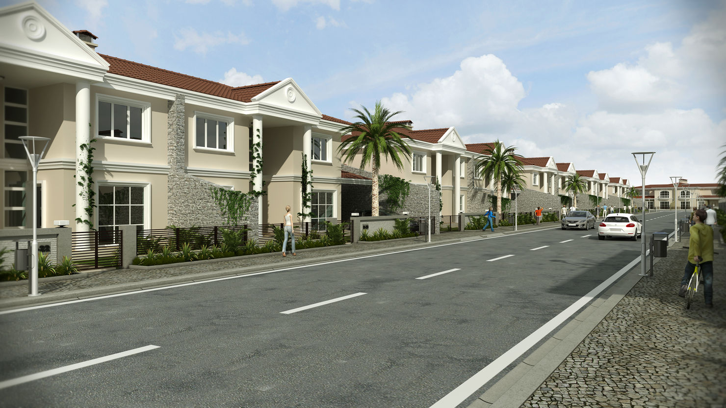 Проект комбинированных домов, выстроенных в линию, специально разработан для узких городских или пригородных участков. Узнаваемый американский стиль подчеркивают белые колонны, фасадная расстекловка окон и декоративные медальоны на фронтонах.