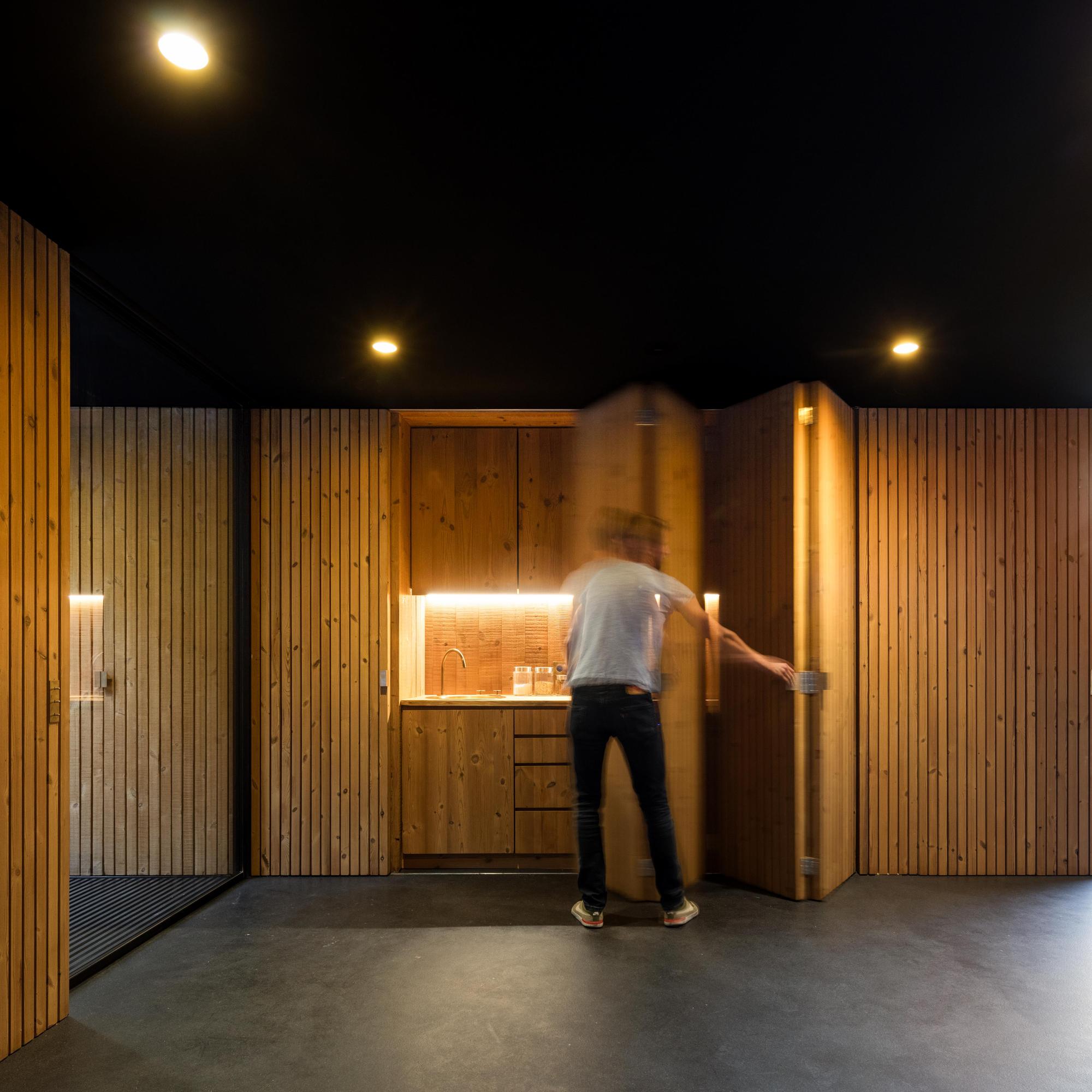 Архитекторы продолжили тему натуральных материалов и внутри. Стены обшиты деревом, причем даже в таких помещениях, как ванная комната. Этот теплый, естественный материал контрастирует с черными потолком и полом, создавая выразительную и современную эстетику.