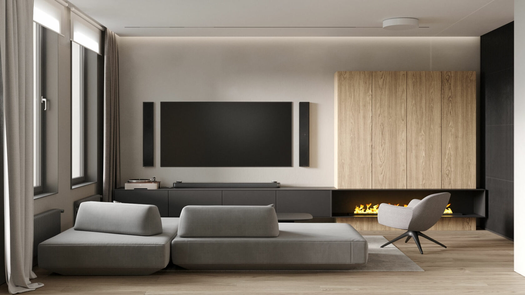 Цветовая гамма гостиной построена на тёплых, глубоких оттенках шоколада. Паркетный пол гармонично сочетается с фактурными 3D-панелями «под кирпич». Центром притяжения стал диван насыщенного трюфельного цвета с массивными подлокотниками. Лофтовый дух поддерживают многорожковые подвесные светильники в чёрном исполнении. Изюминкой пространства стали распашные двери цвета молочного шоколада, ведущие в коридор.