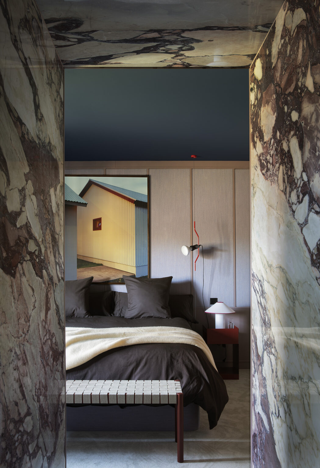Почти вся обстановка в квартире — эксклюзивные предметы, созданные по эскизам самого дизайнера. В них ярко проявляется его увлечение сложными формами и чистыми линиями. Дух середины XX века оживает здесь через геометрические принты на текстиле, смелые комбинации насыщенных и приглушённых цветов, а также через характерные силуэты кресел и столов. Особого внимания заслуживает оформление стены в спальне: её пластичные, текучие формы вызывают ассоциации с творениями Антонио Гауди, перенося нас в солнечную Барселону.