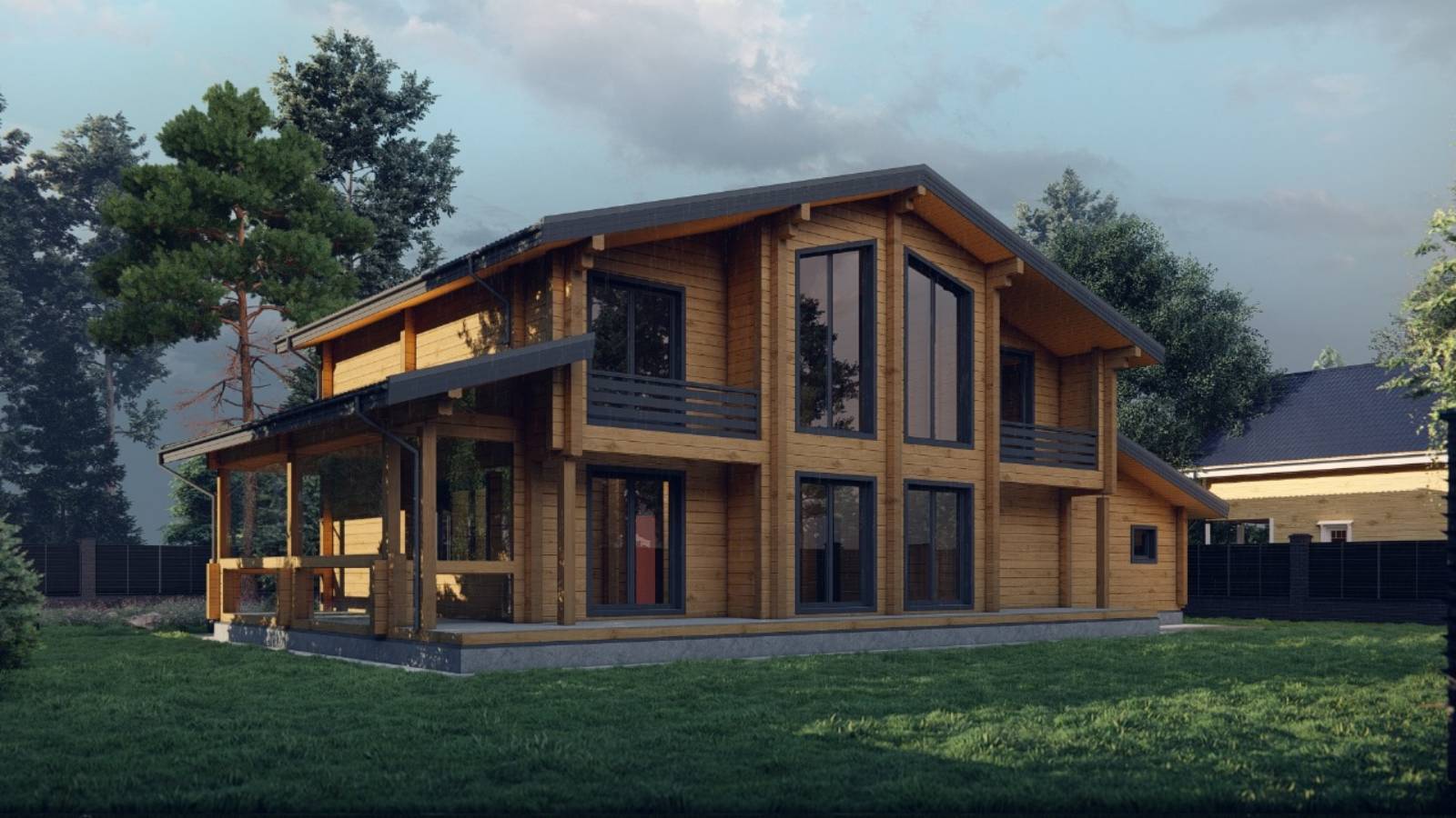 Кровельная конструкция состоит из деревянных ферм, уложенных параллельно короткой стороне дома. Они опираются одним концом на наружную стену, а другим — на каркас террасы. Сама терраса, площадью более 40 м², закрыта стенами с трех сторон, что делает отдых на ней комфортным в любую погоду.