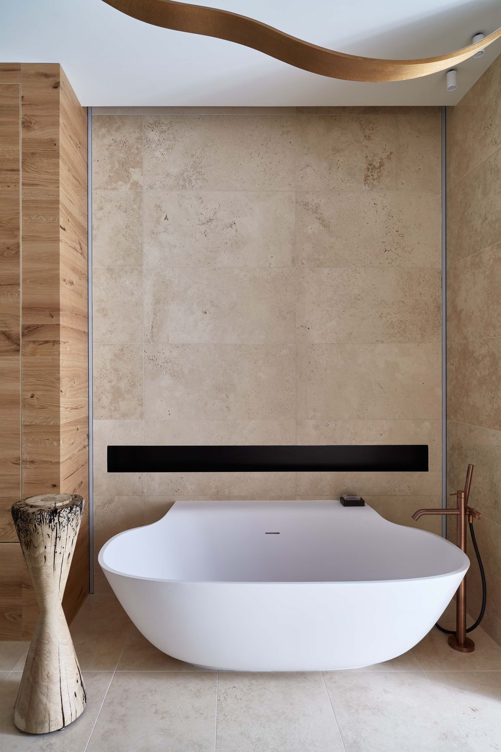 Ванная комната отделана керамогранитом под дерево и светлым травертином бежевого оттенка. Уникальная композиция, центром которой стала дизайнерская чаша в форме ракушки, дополнена нишей и тщательно подобранным декором. Весь ансамбль выглядит очень по-итальянски, воплощая в себе магию высокого дизайна.