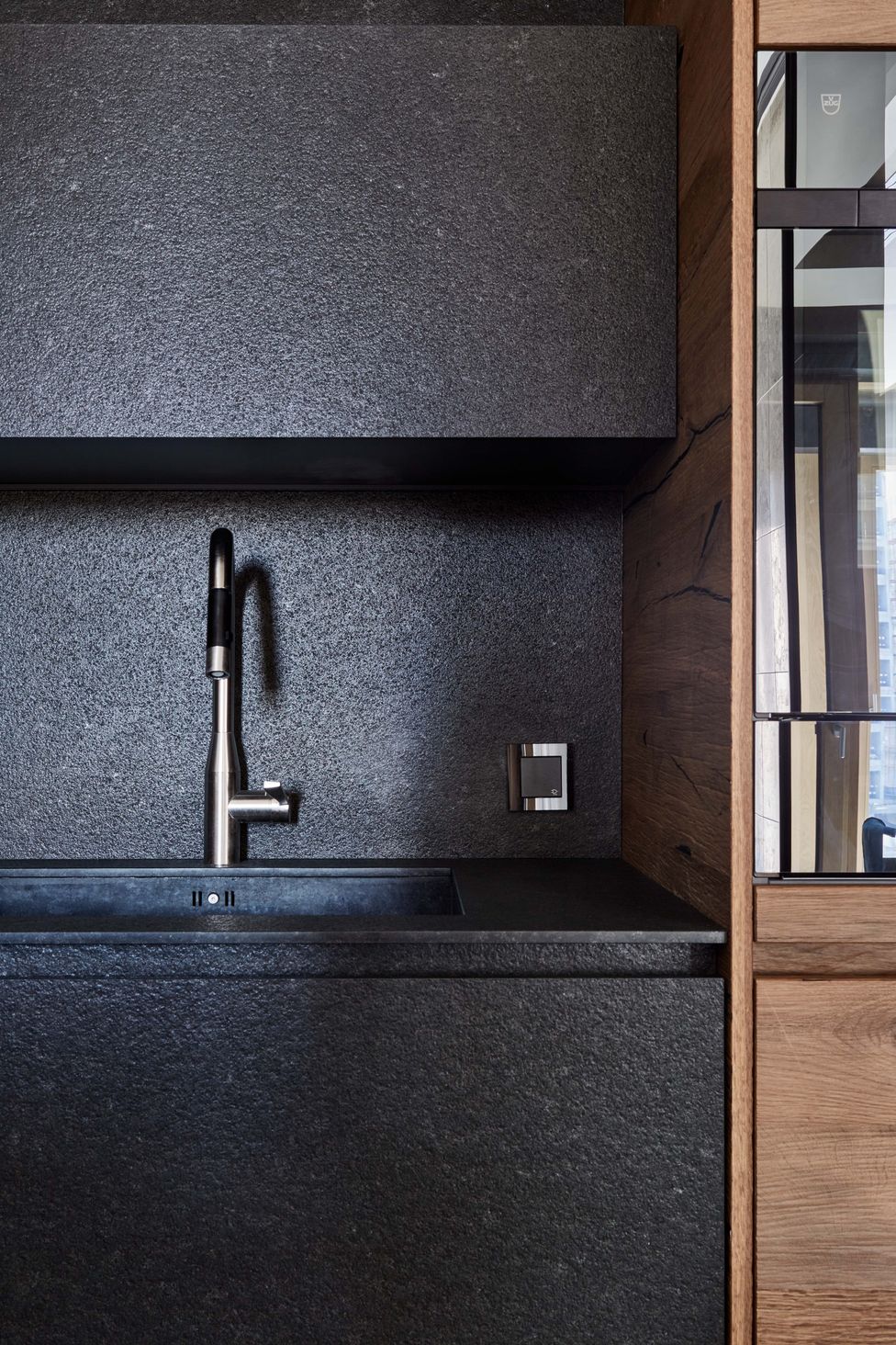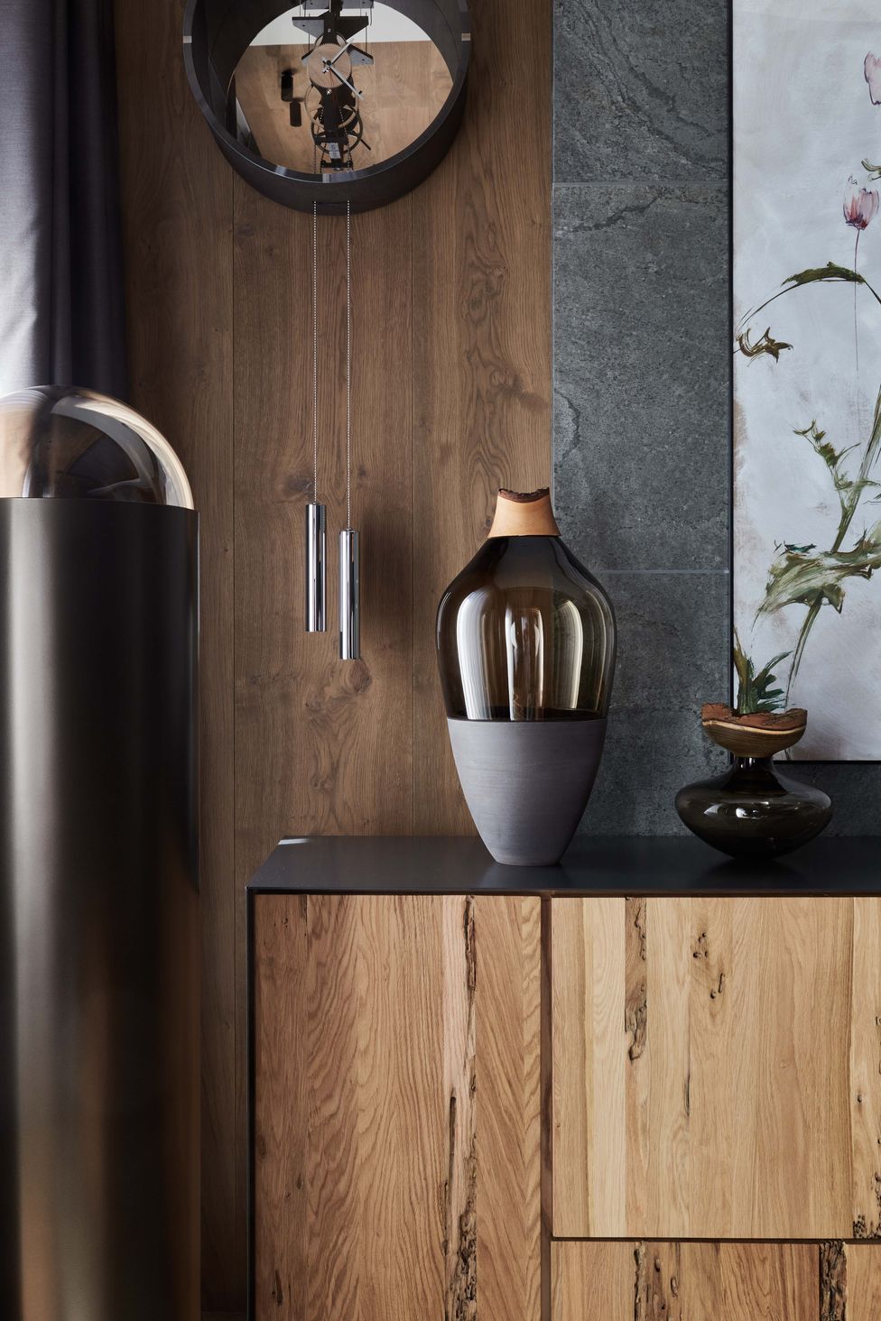Имитация натурального дерева и сланца в отделке кухни создает эффектную стилизацию под уютный альпийский стиль шале. Массивный обеденный стол из слэба, остров, отделанный под камень, декоративные элементы в серых оттенках и деревянная обшивка потолка — все это вместе создает атмосферу горного уединения, полностью стирая ощущение нахождения в московской высотке.