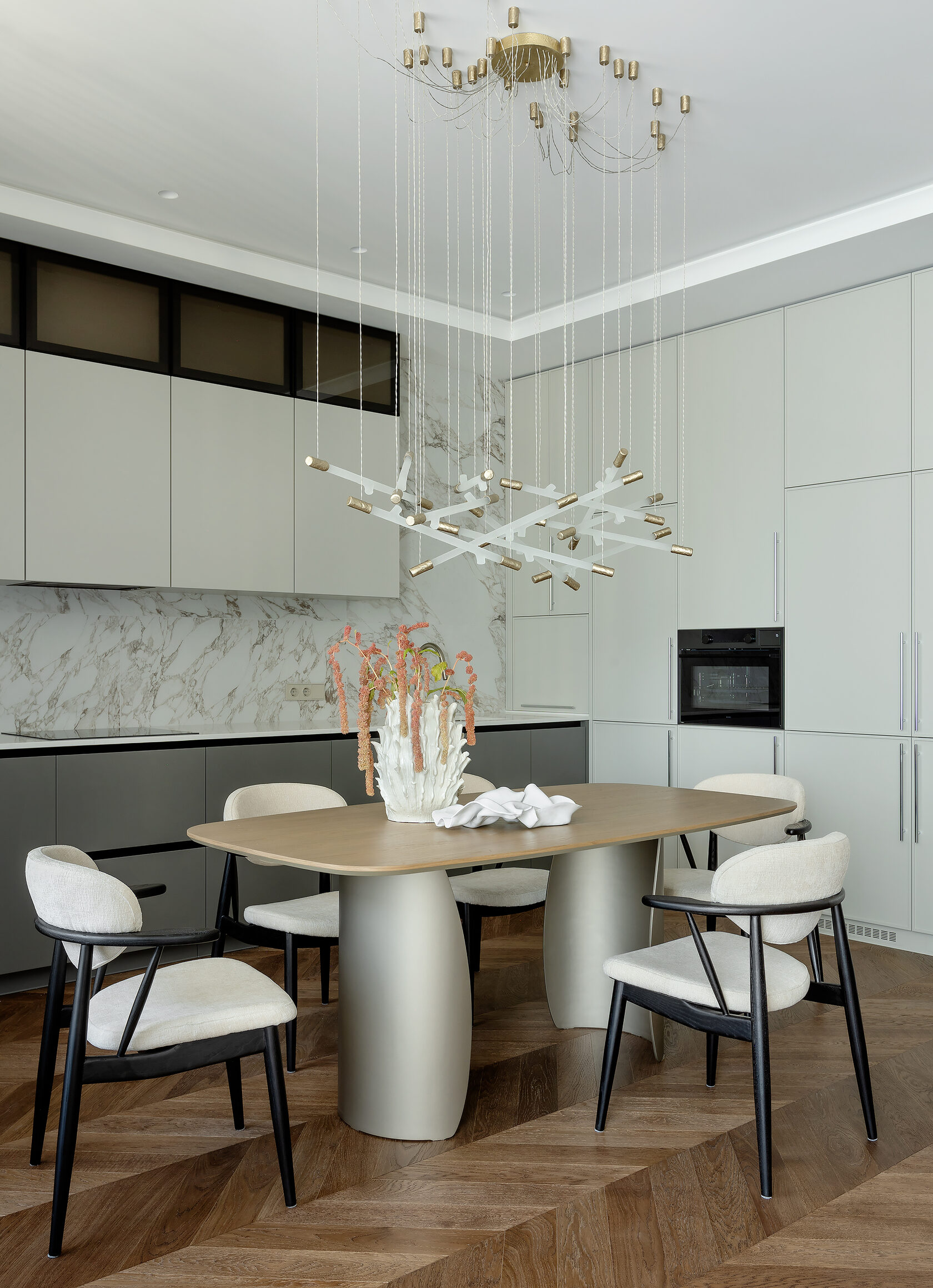 В основе проекта лежали два ключевых принципа: максимальный комфорт для жильцов и их представление об идеальном европейском интерьере. Результат — открытая планировка, которая визуально объединяет зоны, и панорамное остекление, открывающее вид на город. Этот подход создает ощущение свободы и простора, что особенно ценно в городской среде.