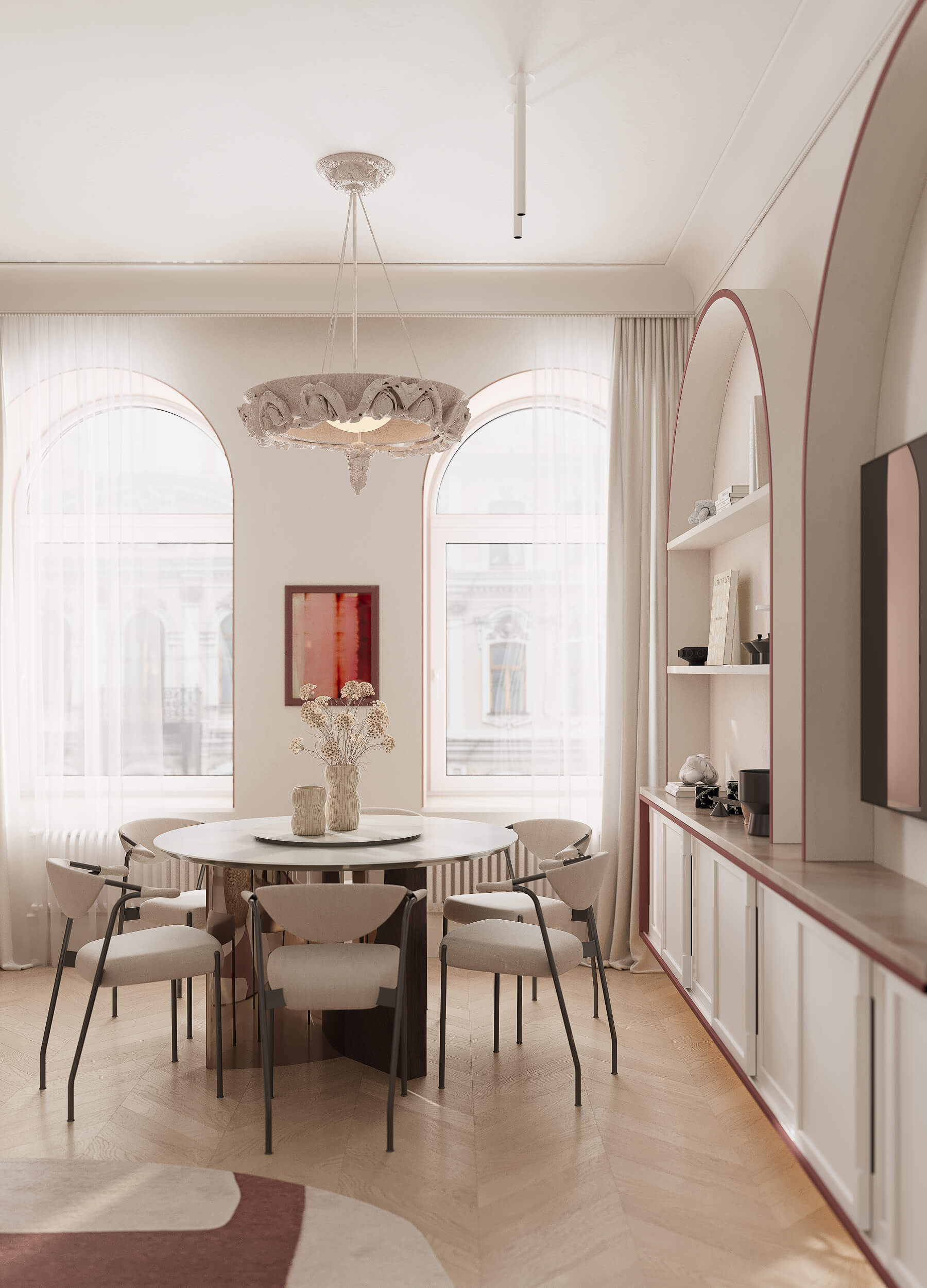 Столовая в лучах света: ар-деко и панорамные окна