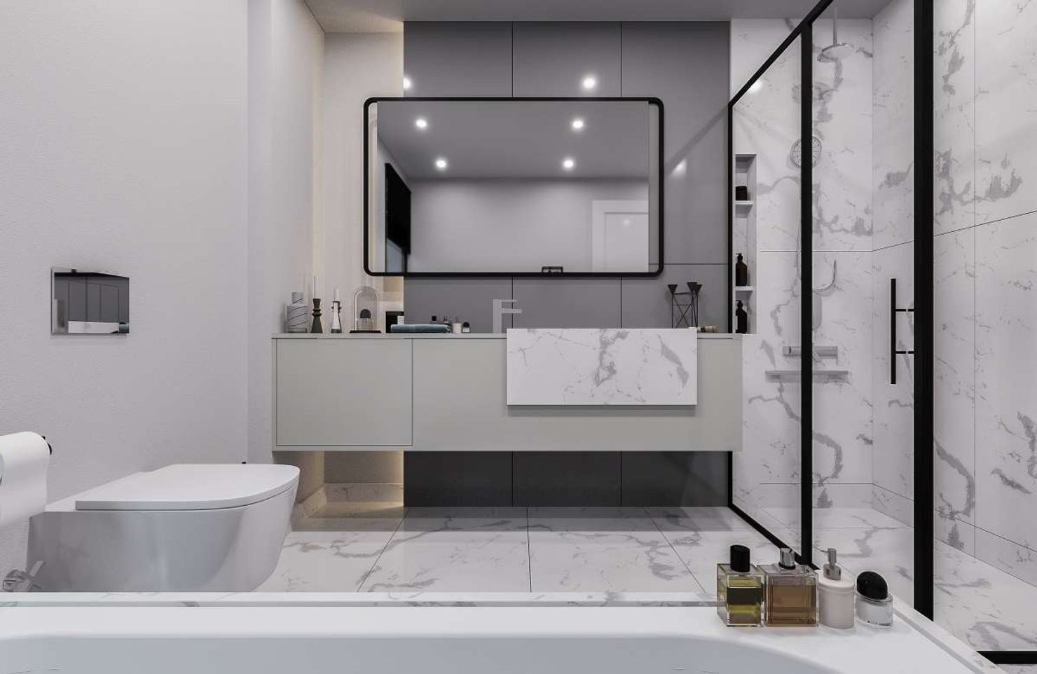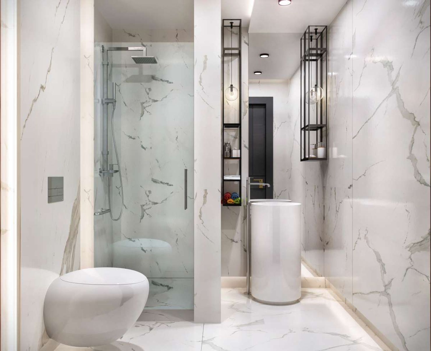 Здесь для имитации греческого мрамора Arktik White использован высококачественный тонкий керамогранит. Материалом оформлены ключевые зоны: душевая ниша, пол и блок у унитаза, создавая целостное и стильное пространство.