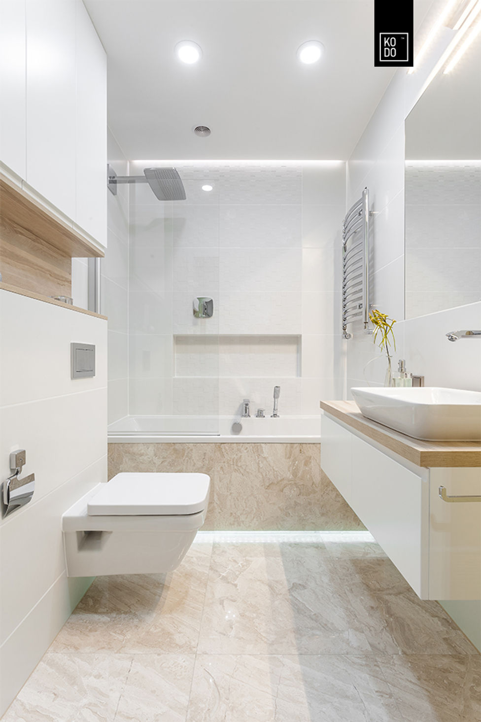 Этот проект — отличный пример бюджетного, но эффектного ремонта. Здесь использован керамогранит небольшого формата, имитирующий итальянский мрамор Bianco Gioia Venato. Его ненавязчивый, изящный рисунок идеально сочетается со светлой палитрой интерьера, становясь центром внимания.