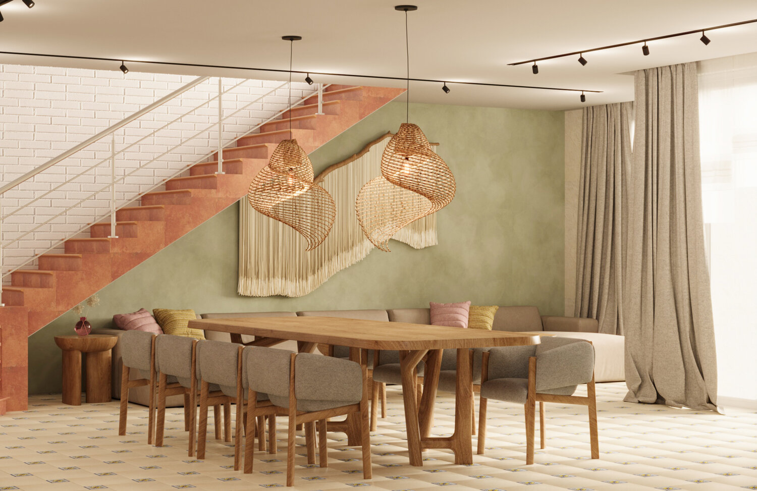 Даже переходные зоны, такие как лестничный холл, получили своё дизайнерское оформление, поддерживающее общую стилистику дома.