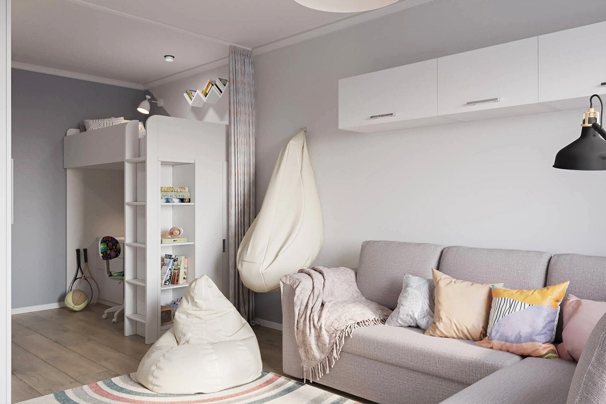 Всё началось с радостной новости: мы ждали первенца. Наша однокомнатная квартира площадью 42 кв. м не имела отдельной детской, поэтому мы решили кардинально изменить гостиную, органично вписав в неё пространство для будущего ребёнка. Главной задачей стало создать уютный и функциональный уголок для малыша, не жертвуя при этом комфортом остальных членов семьи.