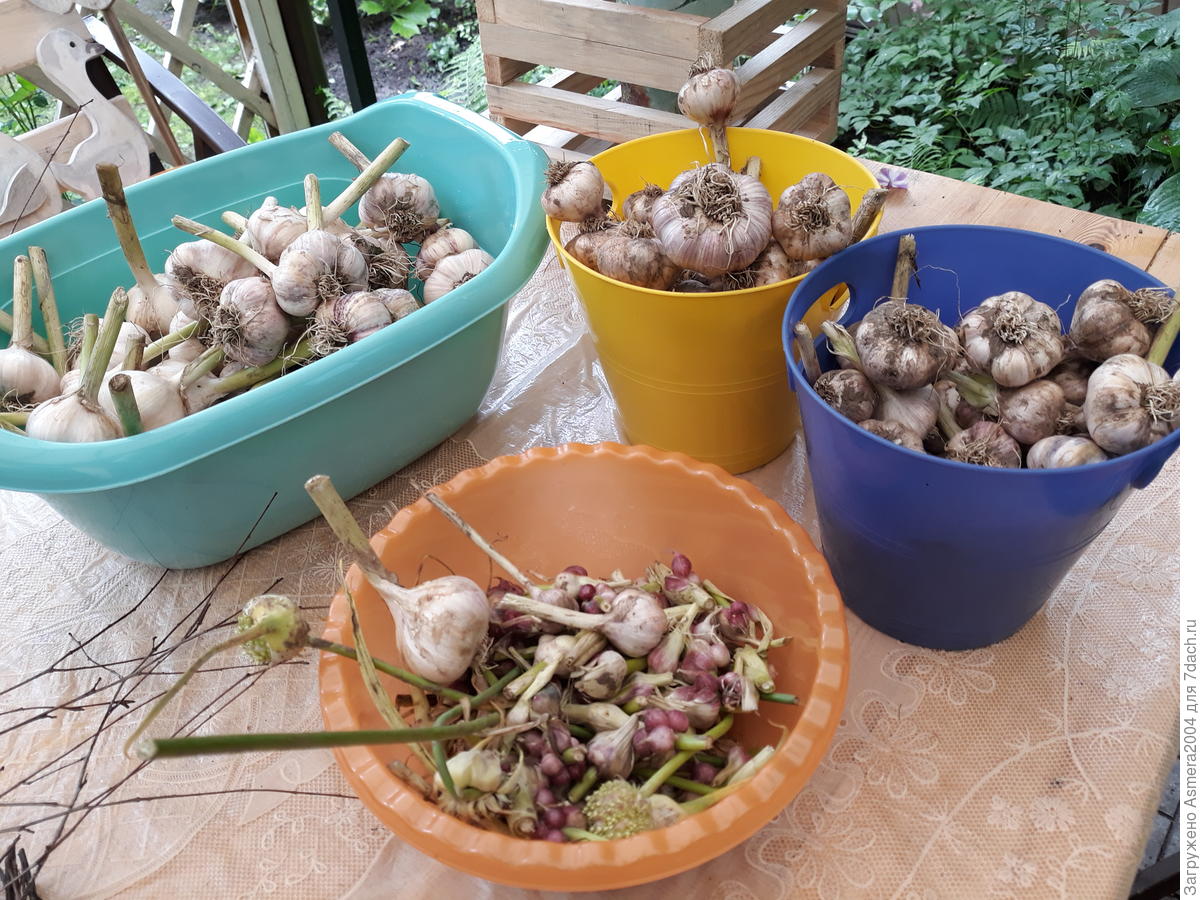 Сроки уборки зависят от сорта: озимый чеснок, посаженный под зиму, убирают обычно в июле, а яровой, который сажают весной, — в августе. После выкапывания чеснок требует тщательной, но бережной просушки. Землю с головок лучше аккуратно убирать руками, чтобы не повредить покровные чешуйки. Перед закладкой на хранение стебель обрезают, оставляя пенек около 3 см, а корни подрезают.