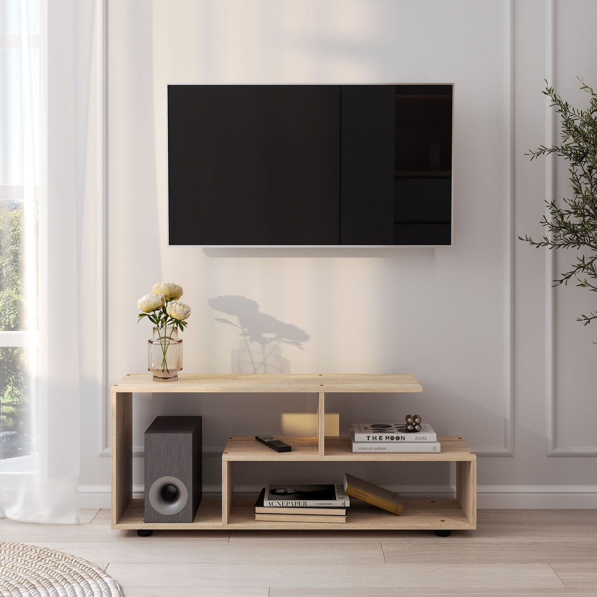 Здесь нет жёстких правил, но есть рекомендации для комфорта. Ширина тумбы должна быть как минимум равна ширине телевизора, а лучше — превышать её. Это обеспечит устойчивость и даст место для размещения дополнительной техники или декора.
