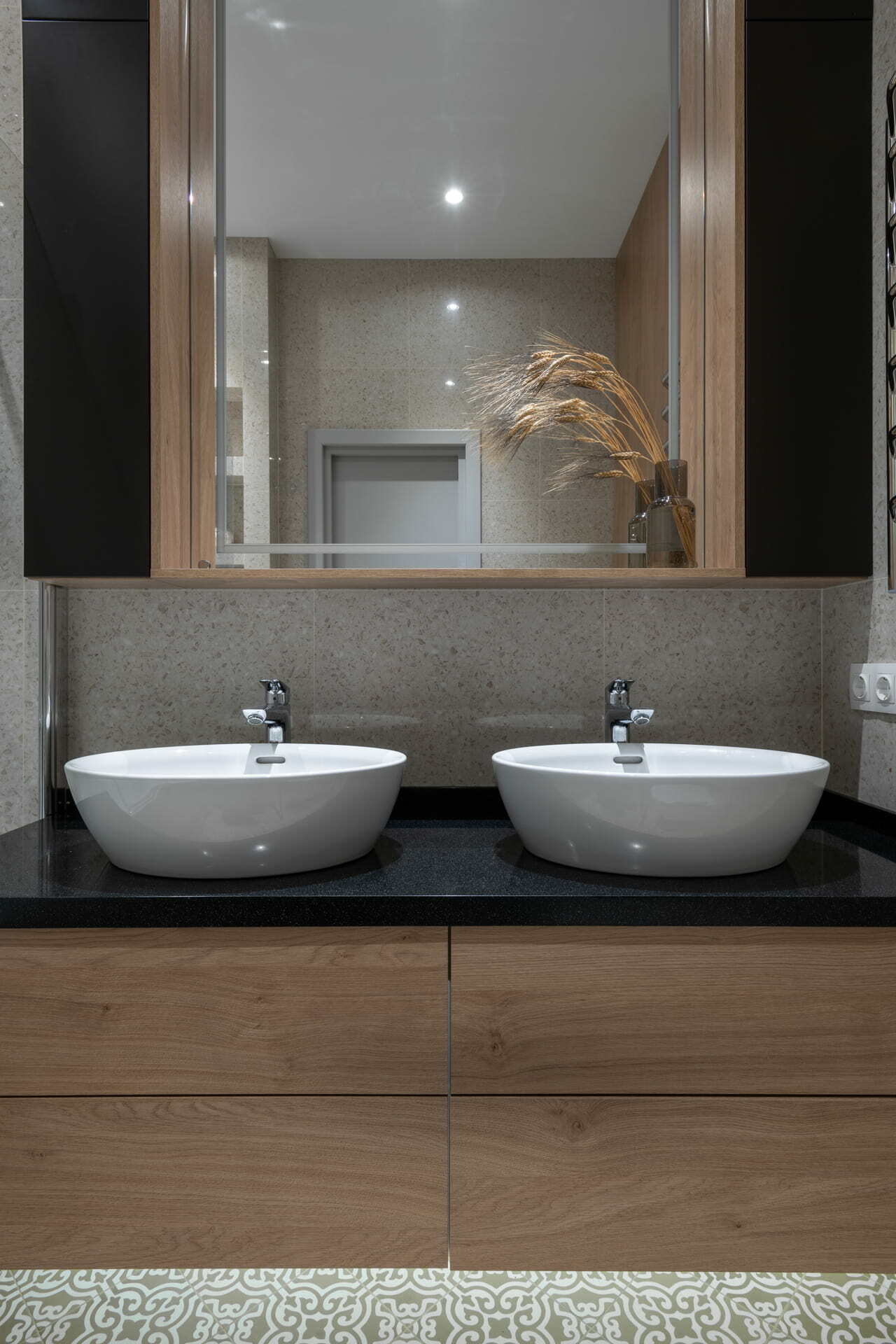 Дизайн ванной комнаты включал эффектную навесную тумбу под две раковины и обязательный элемент — зеркало с подсветкой и полочками для хранения необходимых предметов. Мы строго следовали проекту, изготовив также шкафчик над инсталляцией. Вся мебель для ванной выполнена из высококачественного влагостойкого МДФ. Мы всегда подчеркиваем: в помещениях с повышенной влажностью экономить на материалах категорически не рекомендуется.
