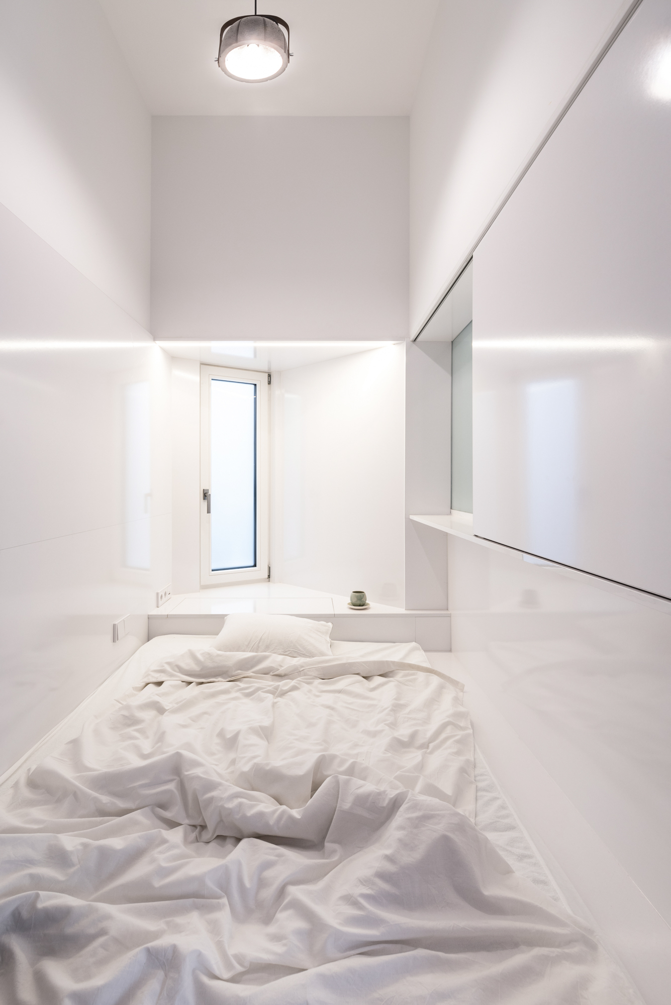 Каждый сантиметр площади использован с умом. Спальное место, встроенное в нишу, напоминает уютную капсулу в японском отеле. Наличие окна обеспечивает приток естественного света, делая пробуждение легким, а сон — комфортным. Рядом расположен компактный кухонный блок, который, как и другие зоны, скрывается за шторой. В гостиной удалось сохранить достаточно свободного места, а многофункциональный стол служит и обеденной зоной, и рабочим кабинетом.