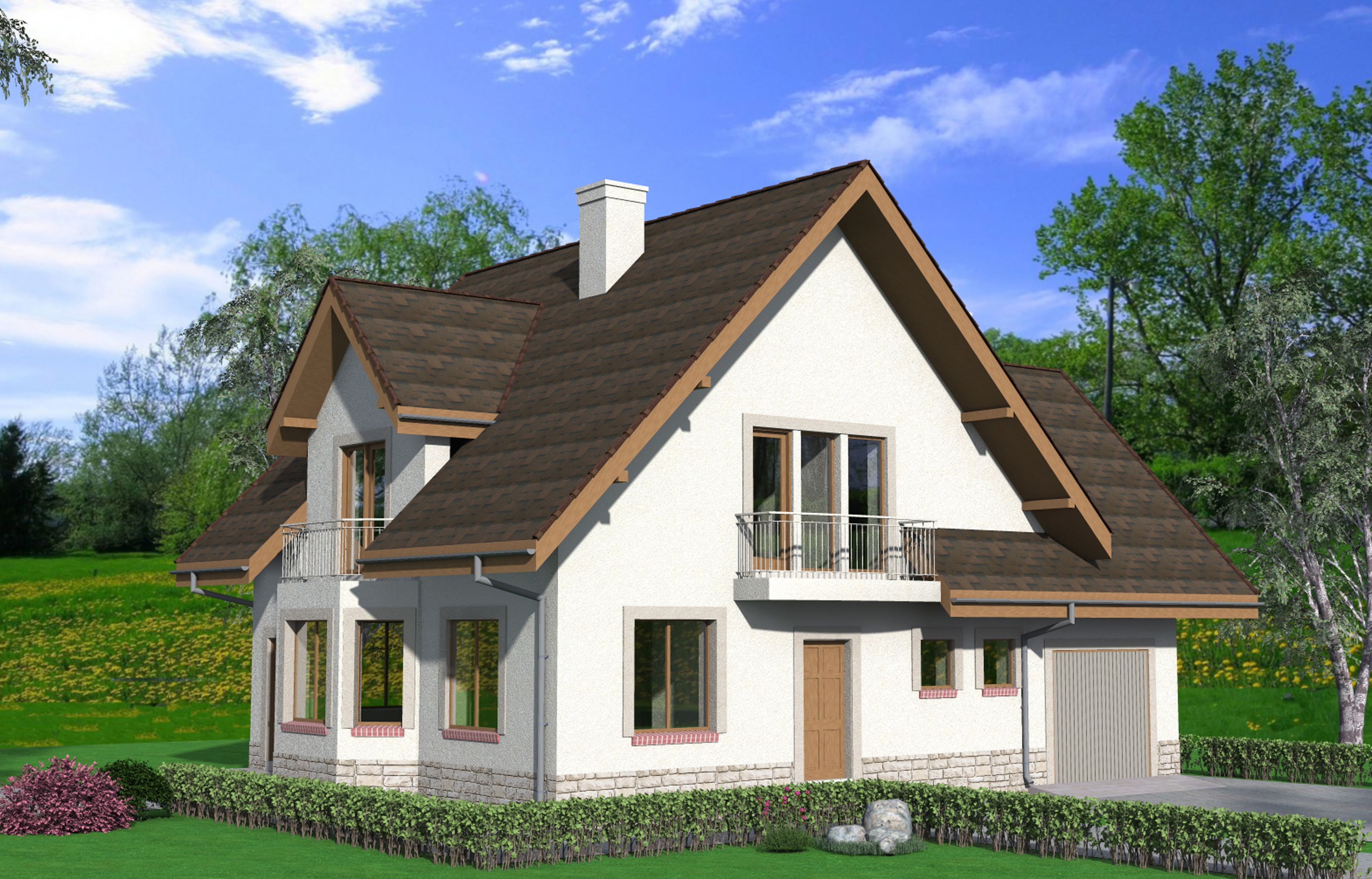 Этот шикарный дом предполагает отделку фасада штукатуркой и вагонкой в альпийском стиле, что компенсирует скромный внешний вид пеноблока.