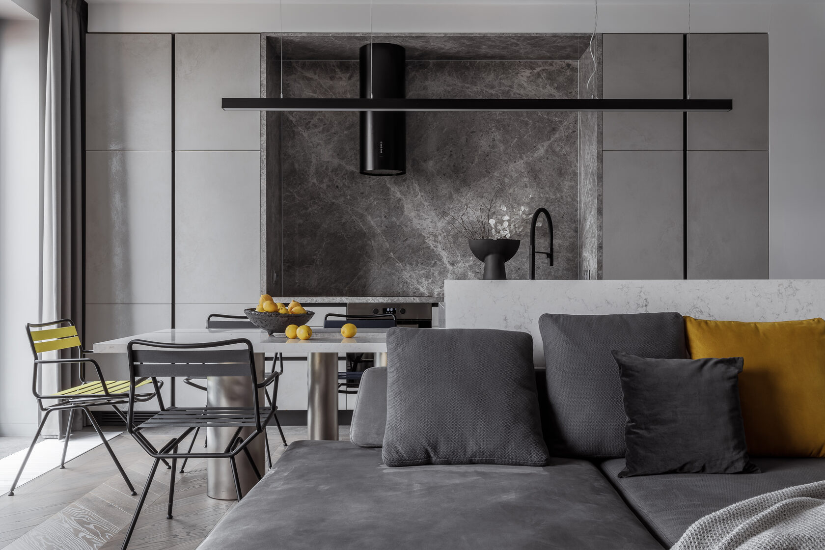 Концепция минимализма и лаконичности может воплощаться бесконечным количеством способов. В данном проекте архитектор сделал ставку на тщательный подбор материалов и тонкую нюансировку оттенков серого. В результате пространство площадью 160 квадратных метров не кажется скучным или безликим. Напротив, интерьер получился живым и динамичным, где каждая зона, даже в рамках открытой планировки, обрела свой характер.