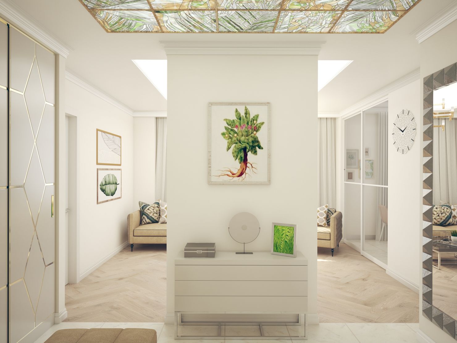 Светлая палитра, скрытая подсветка и качественные материалы — паркет «французская елочка» и керамогранит под мрамор — создают ощущение легкости и роскоши. Нежные зеленые и розовые акценты добавляют интерьеру свежести и утонченности.