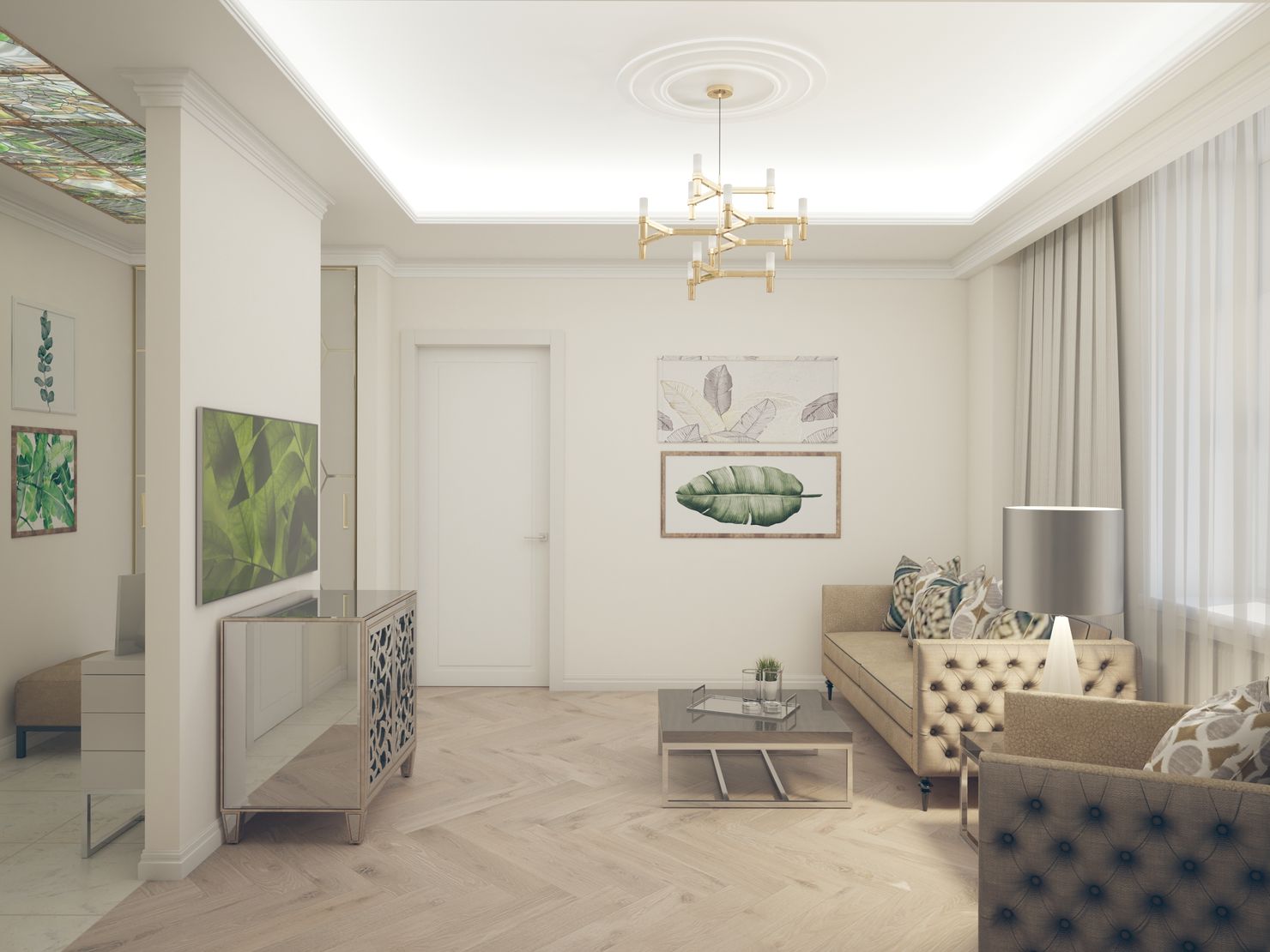 Сердце квартиры — гостиная — оформлена в мягких, теплых тонах. Диван и кресло бананового оттенка прекрасно гармонируют со светлым паркетом, столиками на золотых ножках и пепельными шторами. Современный потолок со встроенной подсветкой и эклектичная люстра завершают образ, балансируя между классической торжественностью и современным лаконизмом.