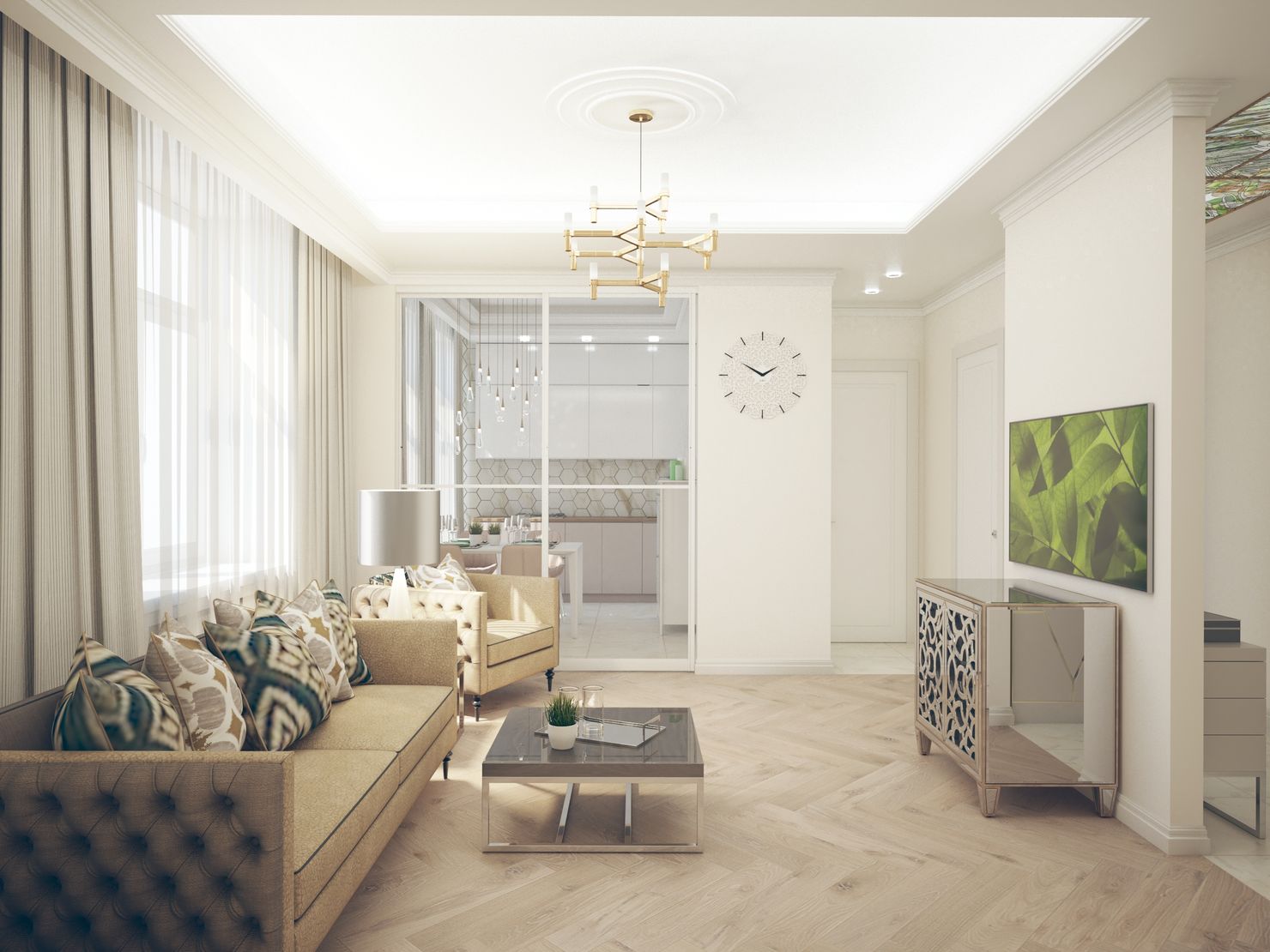 Просторная двухкомнатная квартира, разработанная дизайнерами студии Андреевы.РФ, представляет собой яркий пример современной неоклассики. В проекте гармонично сочетаются актуальные тренды — зеркальная мебель, двухцветная кухня, раздвижные стеклянные перегородки — и грамотная перепланировка, преобразившая пространство.