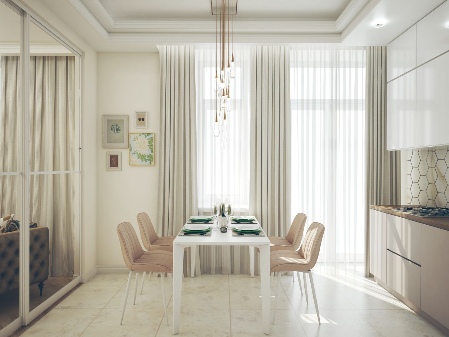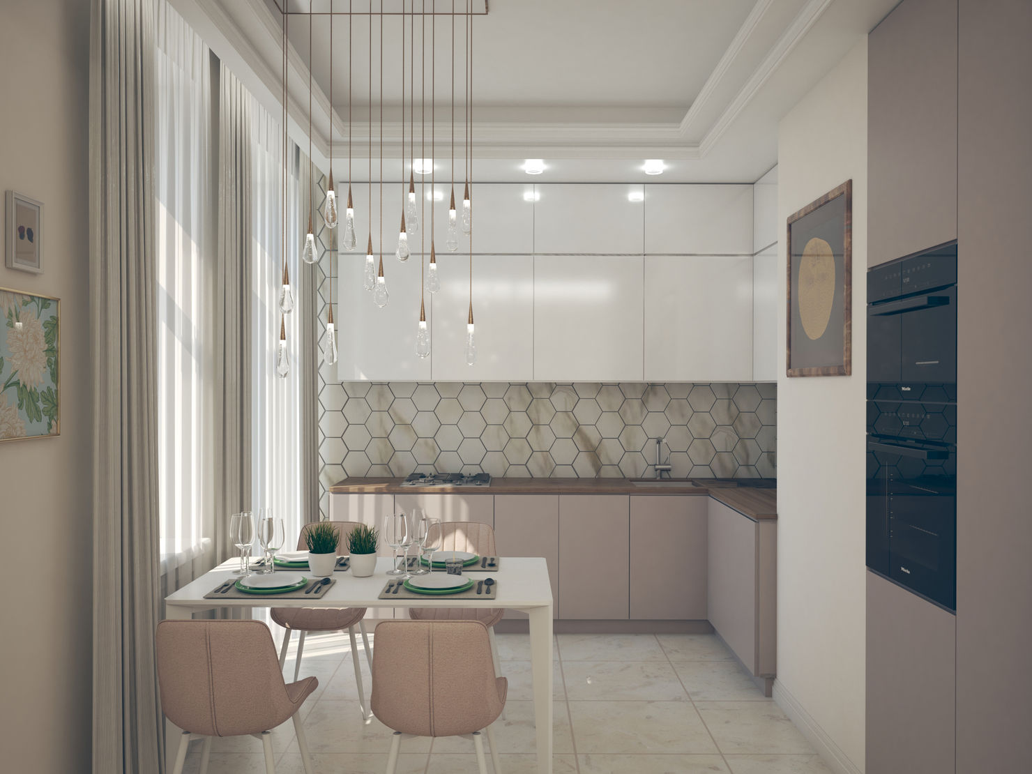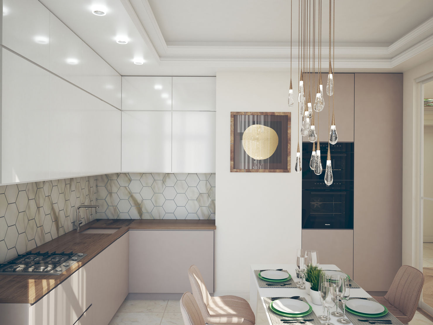 Особое внимание уделено световому сценарию. Эффектная люстра в стиле контемпорари парит над обеденной зоной, а в рабочей части кухни встроенные споты обеспечивают идеальное освещение. Несмотря на скромную площадь (около 10 кв. м), эта кухня является эталоном грамотного дизайна и эргономики.