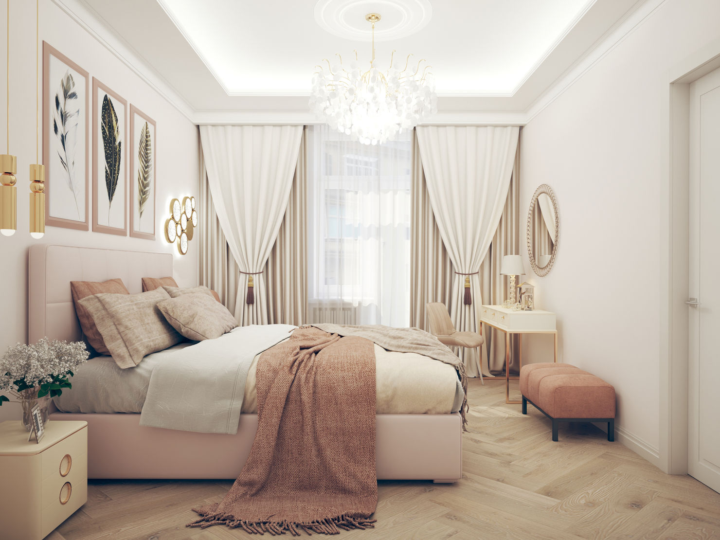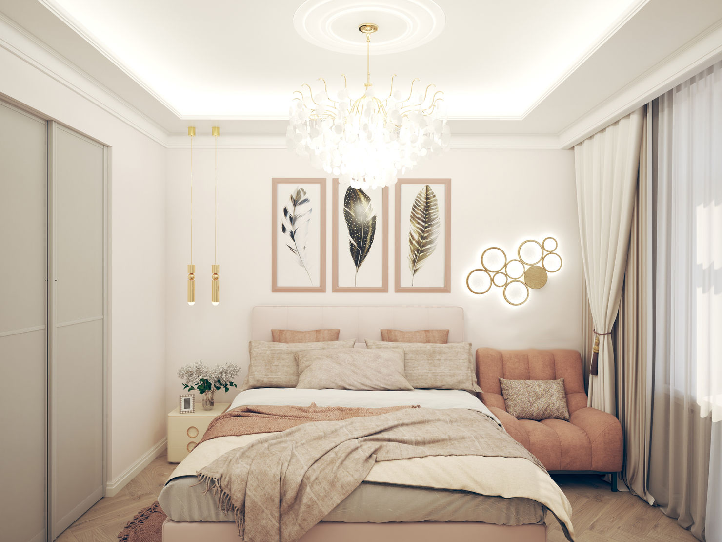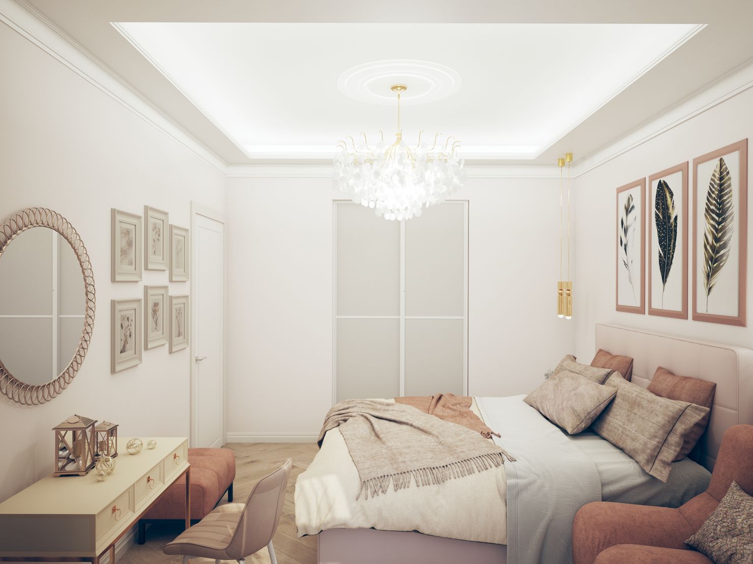 Спальная зона решена в нежной палитре персиковых и льняных оттенков, которые контрастируют со светлым полом и белыми стенами. Роскошная классическая люстра задает тон, а современная практичная мебель обеспечивает комфорт. Это пространство, где царит атмосфера умиротворения и отдыха.