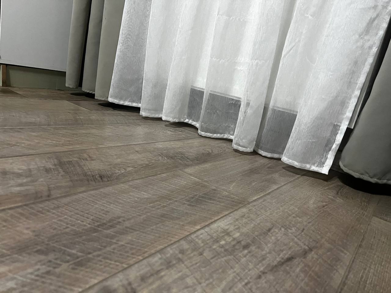 - Неожиданно быстрый износ: Самый серьёзный минус, с которым мы столкнулись, — ламинат катастрофически быстро стёрся в зоне, где стоит компьютерное кресло на колёсиках. Для покрытия 33-го класса это стало неприятным сюрпризом. Также заметны потёртости под ножками дивана, хотя мы его практически не передвигаем.