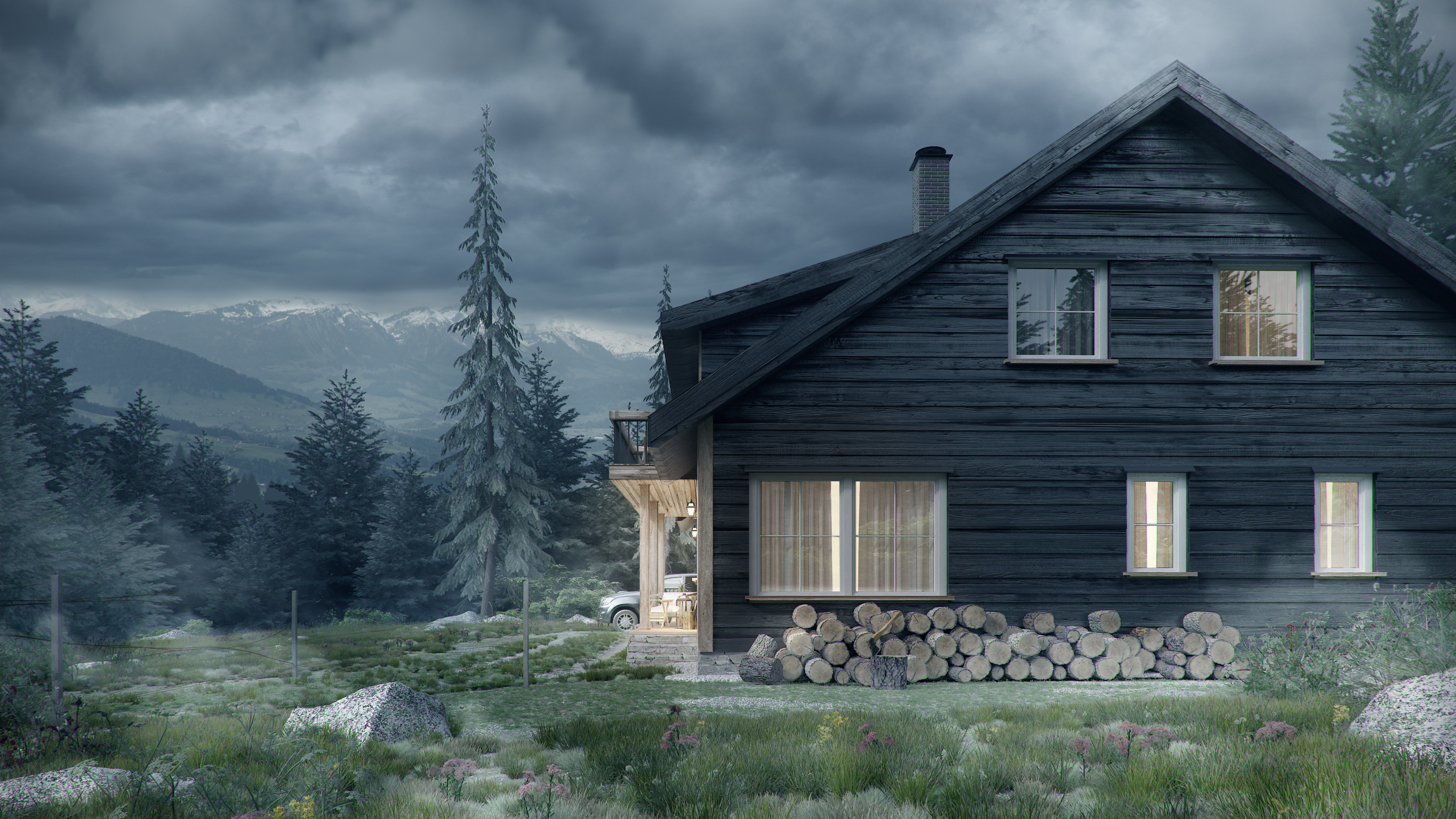Внутреннее пространство продолжает тему единения с природой. Отделка из натурального дерева создает теплую и уютную атмосферу, а главной особенностью являются панорамные окна. Они открывают захватывающие виды на горные пейзажи, что особенно ценно, учитывая расположение дома на высоте около 1000 метров над уровнем моря. Это место предлагает идеальные условия для созерцательного отдыха в любое время года.